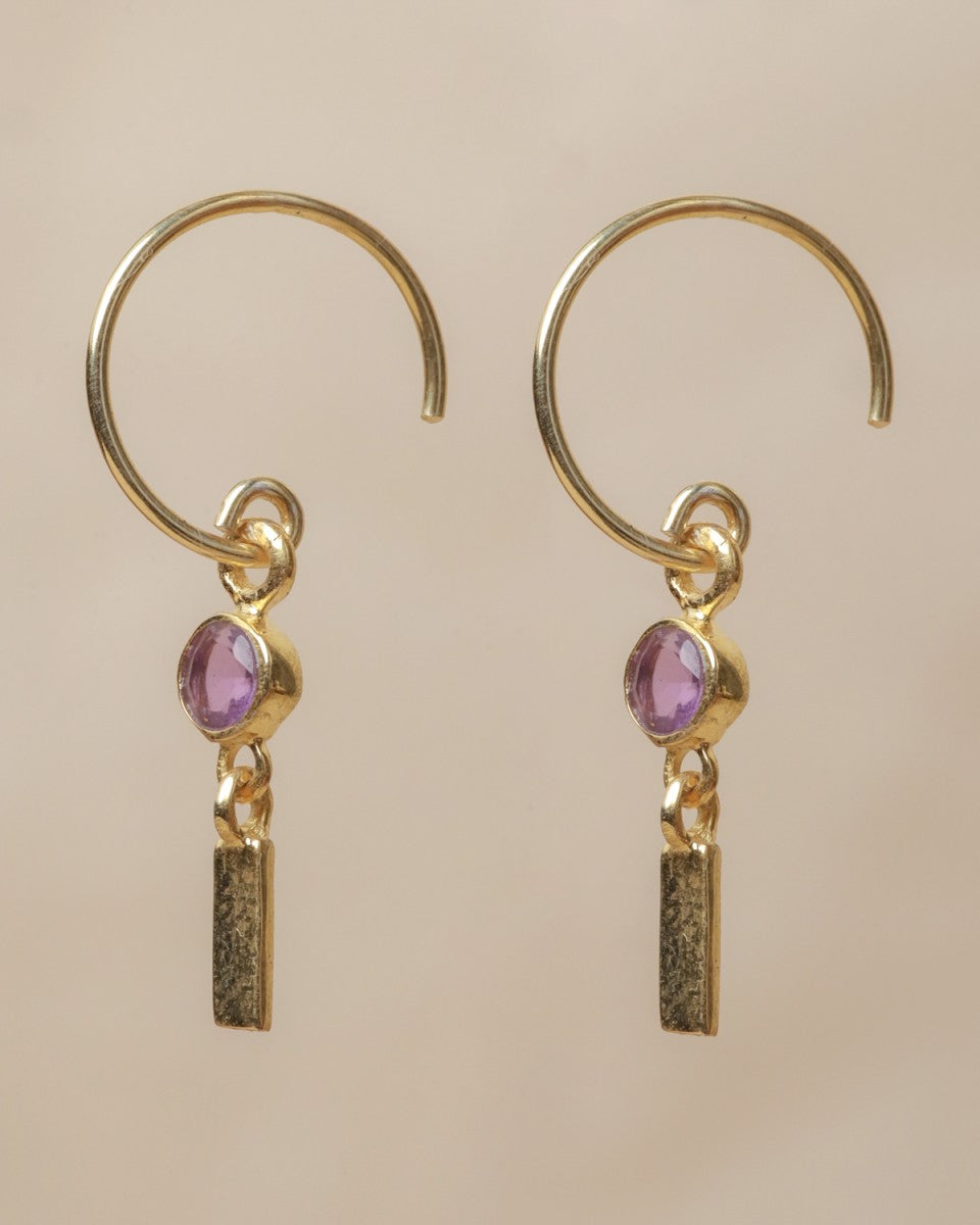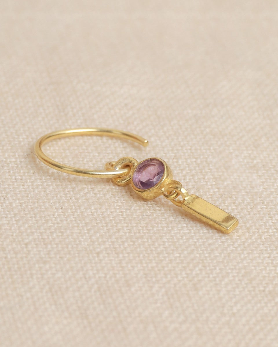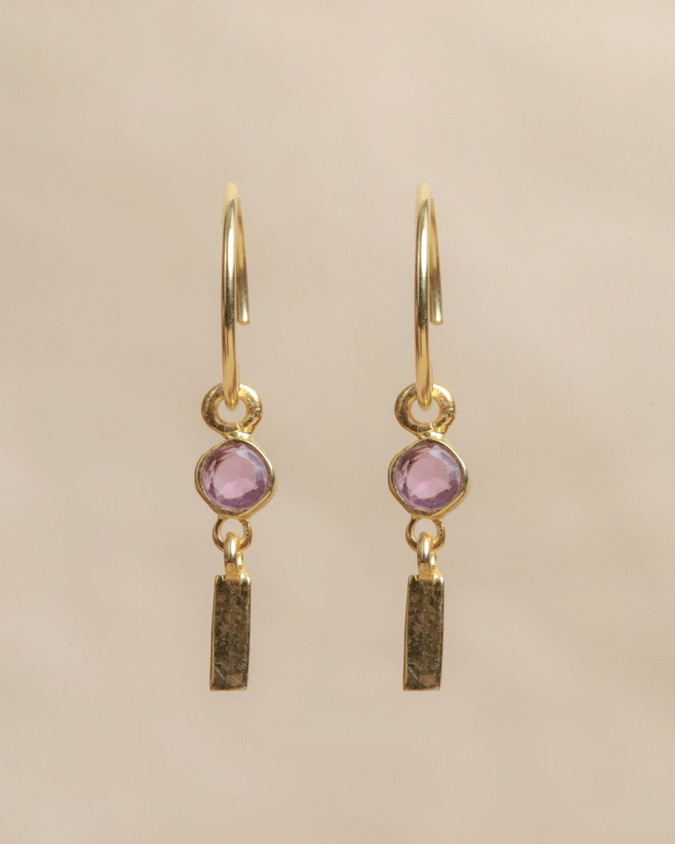 Les mini-créoles Lizza allient délicatesse et caractère. Leur pierre violette lumineuse, suspendue à un pendentif doré texturé, reflète une élégance à la fois douce et affirmée. Un bijou raffiné et intemporel, parfait pour apporter une touche de couleur et de féminité à votre style.