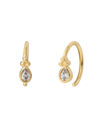 Mini-créoles Labelle ouvertes issues de la collection Liberty ornées d'un petit pendentif strass en forme de goutte. Discrètes et raffinées !