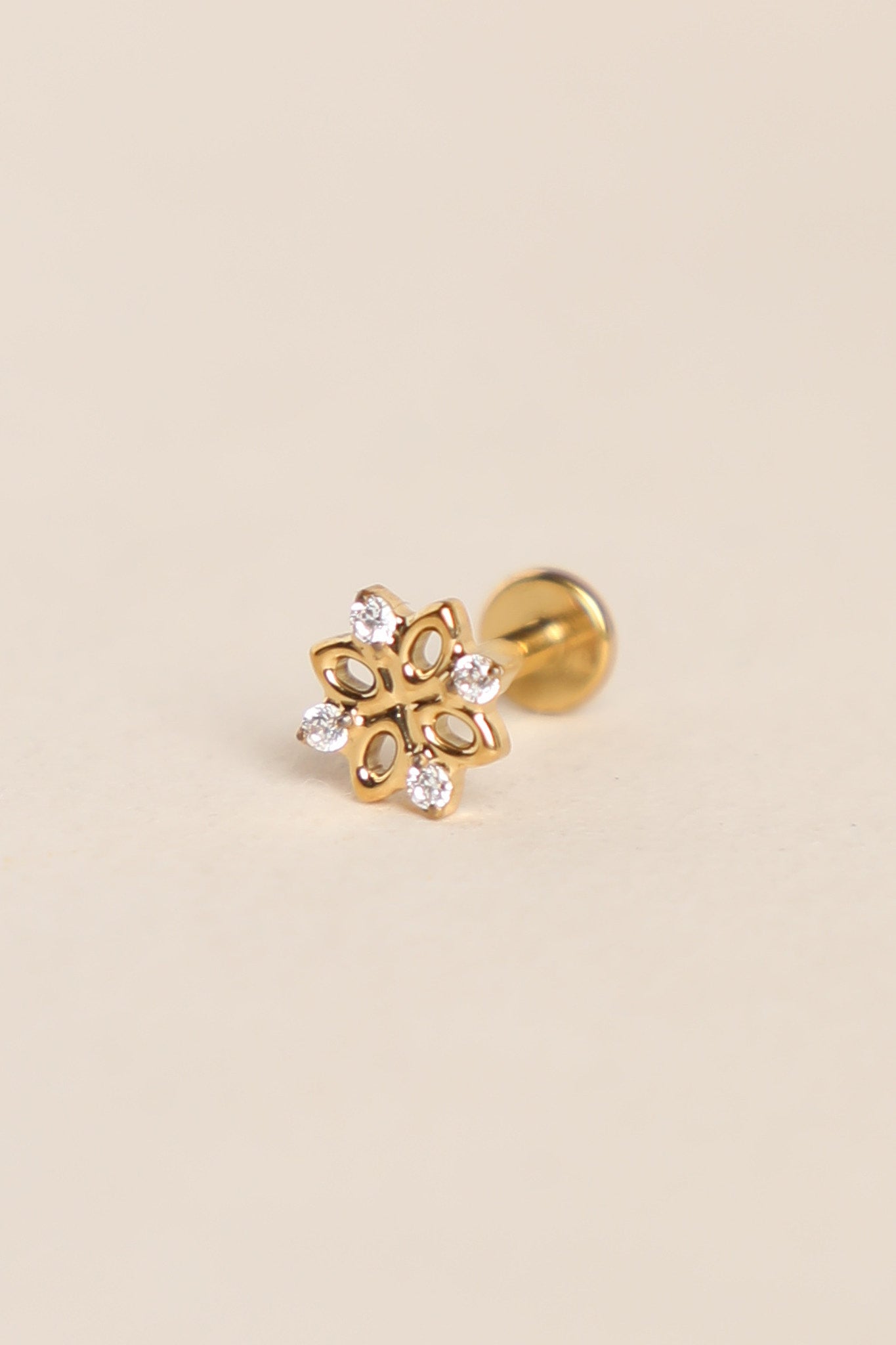 Piercing en titane en forme de fleur et de petits détails en zircon. Idéal pour le tragus, le flat ou le lobe.