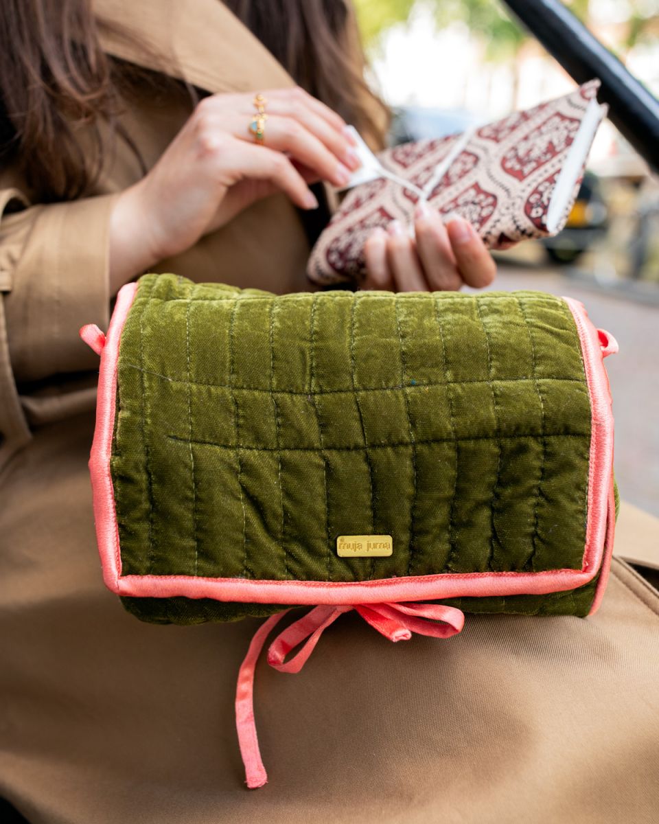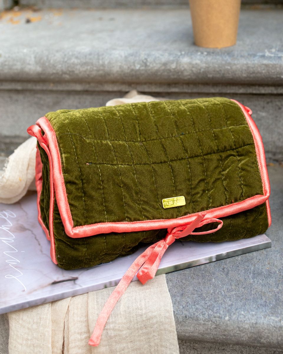 La pochette en velours avec nœud séduit par son allure douce et raffinée. Confectionnée dans un velours vert mousse délicatement matelassé, elle est sublimée par un liseré et un ruban corail qui ajoutent une touche lumineuse et féminine. À la fois pratique et élégante, elle protège vos bijoux ou petits essentiels avec charme et délicatesse. Un accessoire au style intemporel, pensé pour accompagner vos moments du quotidien avec grâce et douceur.