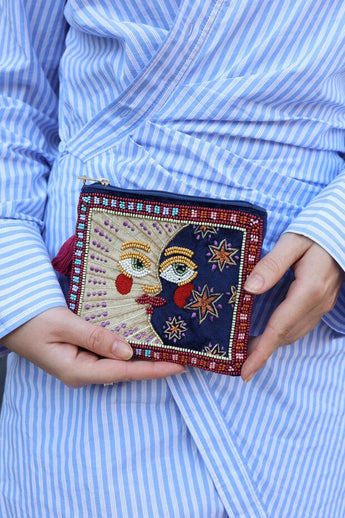 Un bijou d’artisanat empreint de magie ! Entièrement brodée à la main, la pochette Sun & Moon marie les contrastes du jour et de la nuit à travers des perles colorées et des fils dorés. Entre éclat solaire et mystère lunaire, elle incarne l’équilibre parfait. Une pièce unique qui sublime vos tenues et garde précieusement vos essentiels.
