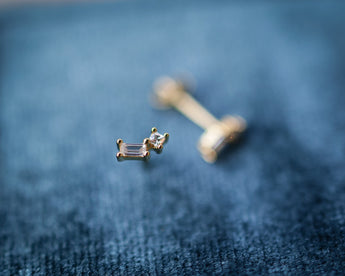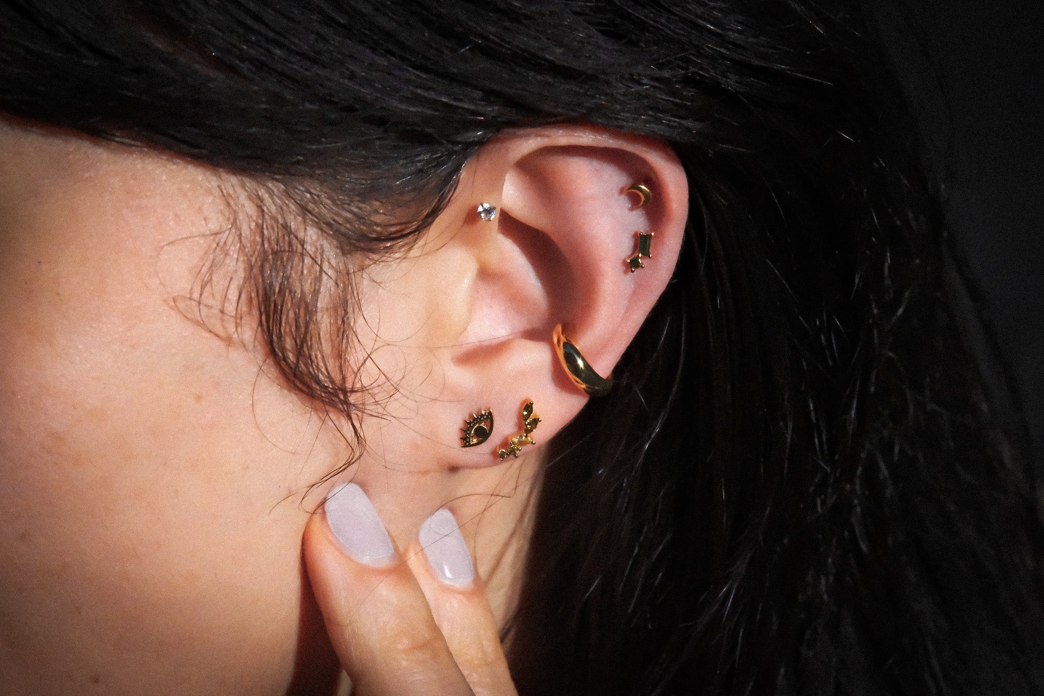 Sur la seconde photo portée, la mannequin porte également les puces Orion, les puces Yogi et le piercing Moon.