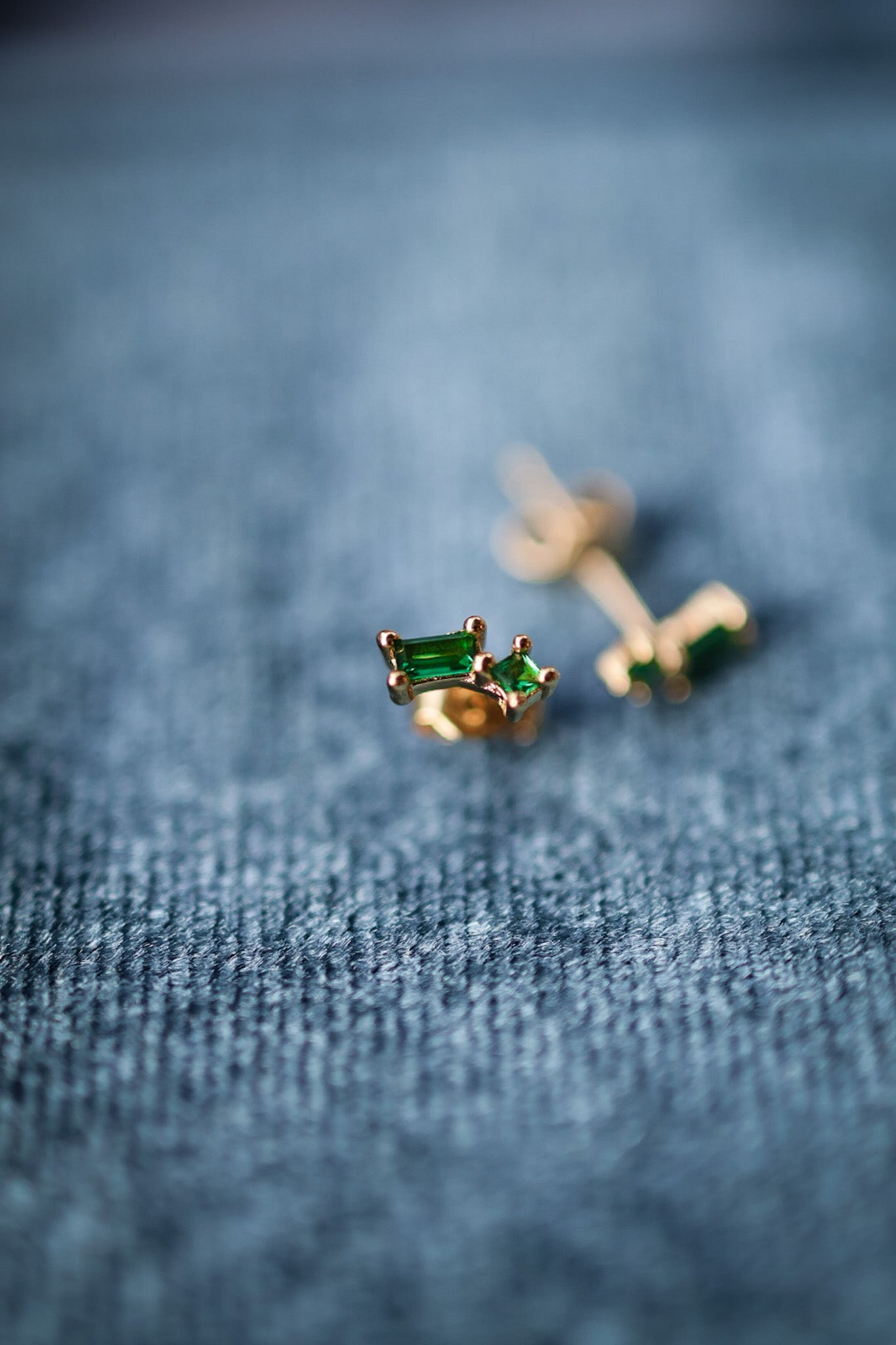 Sur la troisième photo portée, la mannequin porte également les boucles Hudson, les puces Kirby cristal, les puces Willy Cristal et les puces Siggi Péridot.