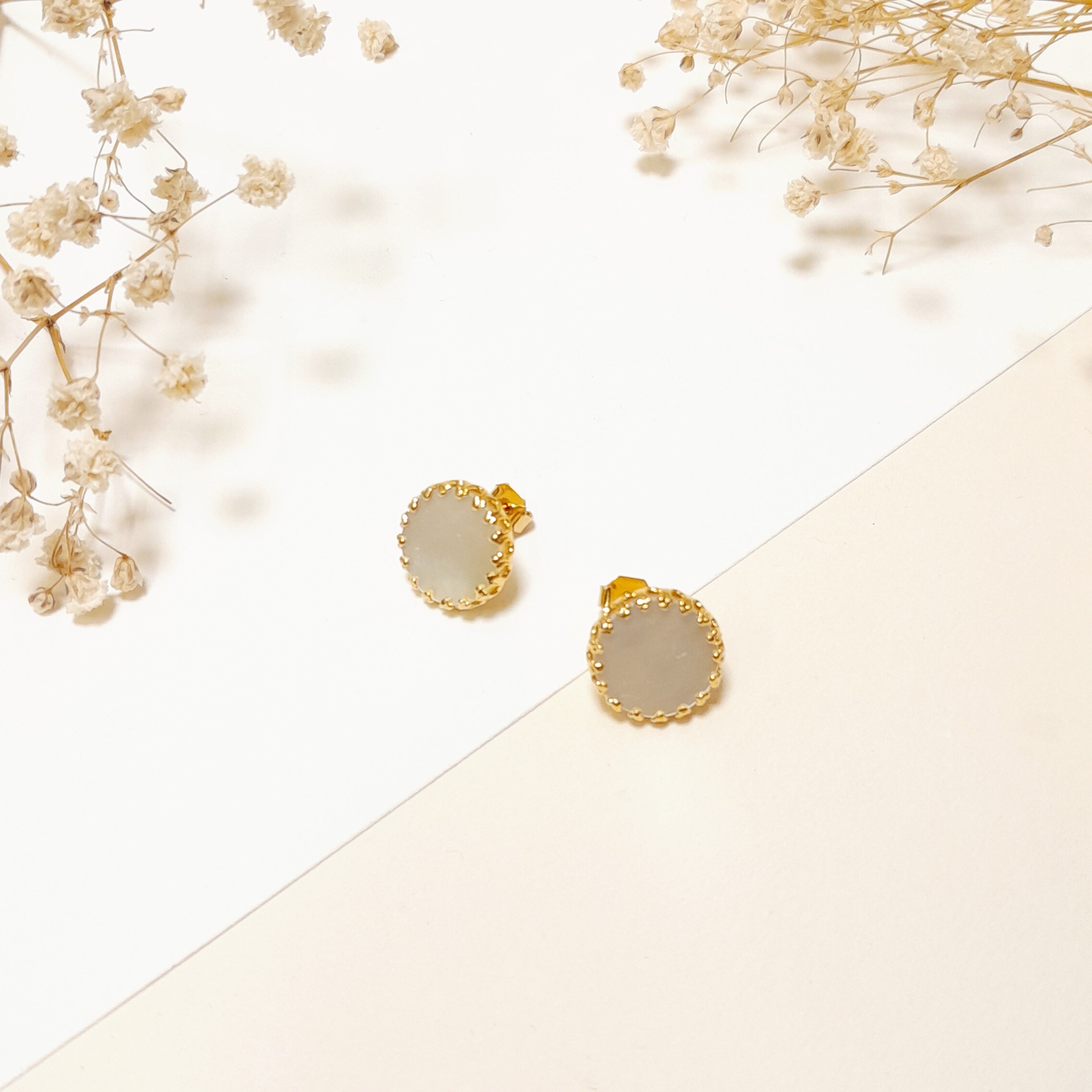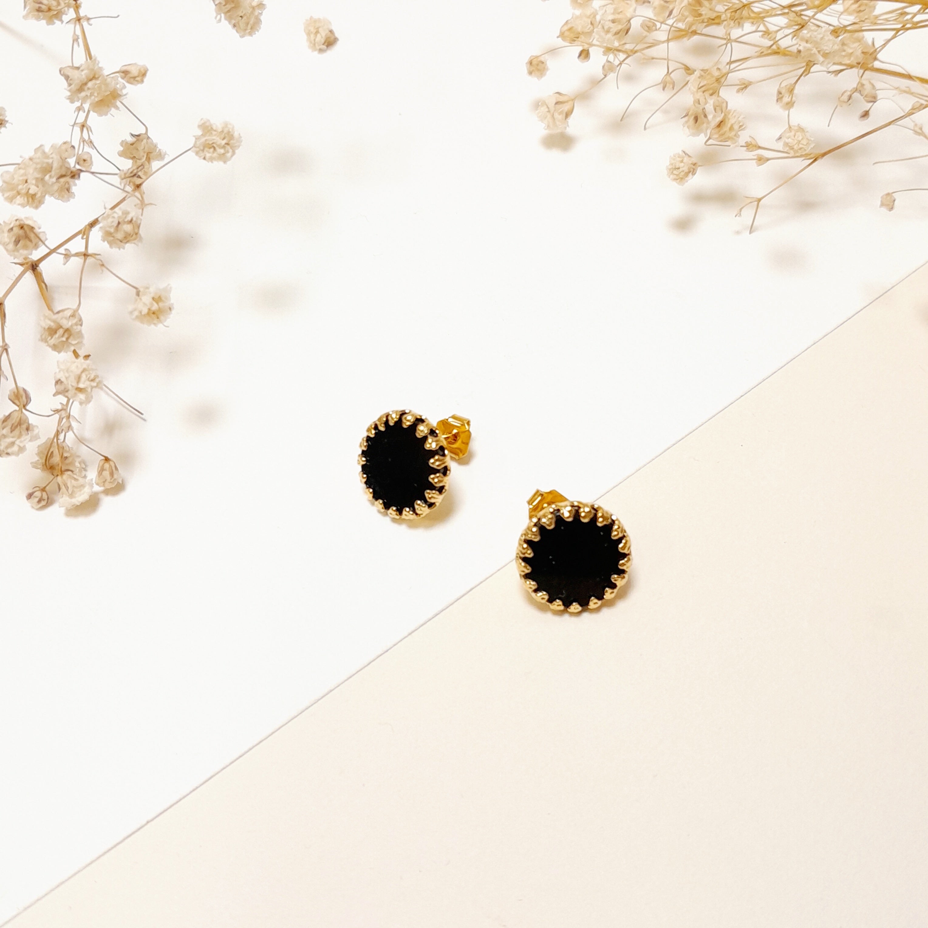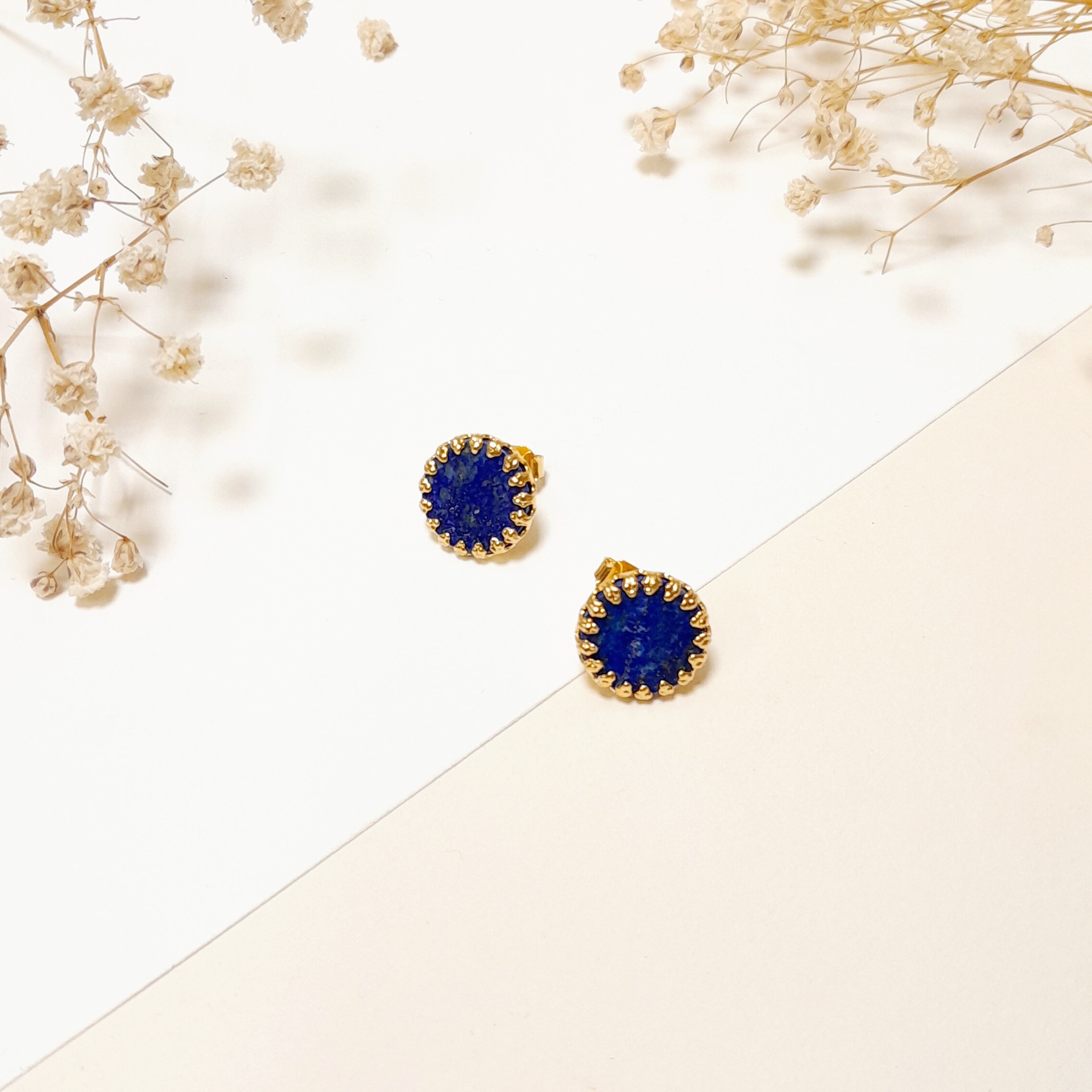 Boucles puces ornées d'une pierre naturelle plate de 12 mm serties de picots.