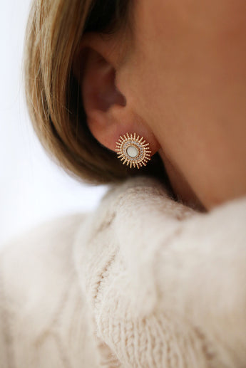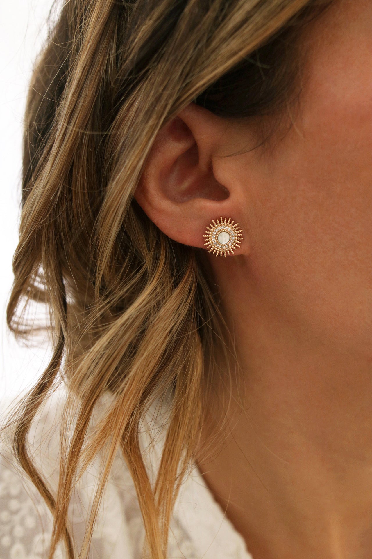 Les puces Elora capturent la lumière avec éclat. Leur design solaire, sublimé par une nacre délicate et un cercle scintillant de pierres fines, illumine le visage d’une élégance intemporelle. Un bijou lumineux, parfait pour rayonner au quotidien comme lors des grandes occasions.