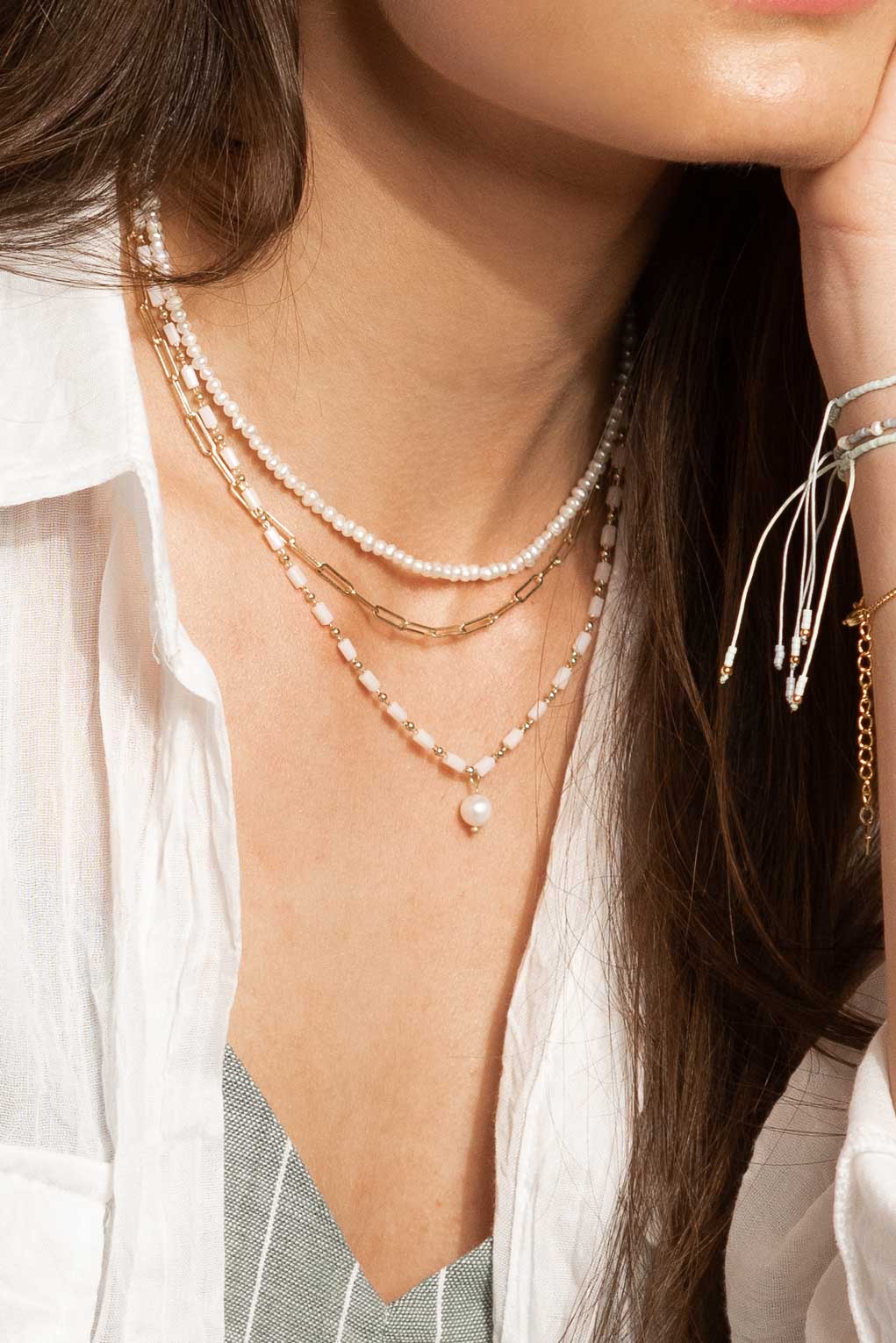 Le collier Alexa ne ressemble à aucun autre collier avec un pendentif en perles. Composé de deux rangs de chaînes en laiton plaqué or de haute qualité et de perles de verre colorées, combinées à un pendentif en perle naturelle.