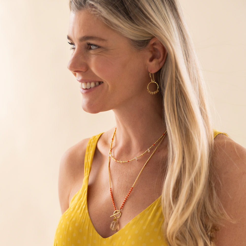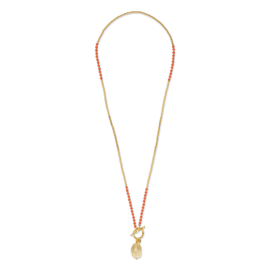 Ce collier Secure, fait main, associe des perles en verre colorées à un pendentif en pierre naturelle. Il se ferme à l'aide un fermoir toggle plaqué or, alliant élégance et sécurité. Un bijou qui soutient votre énergie positive au quotidien.
