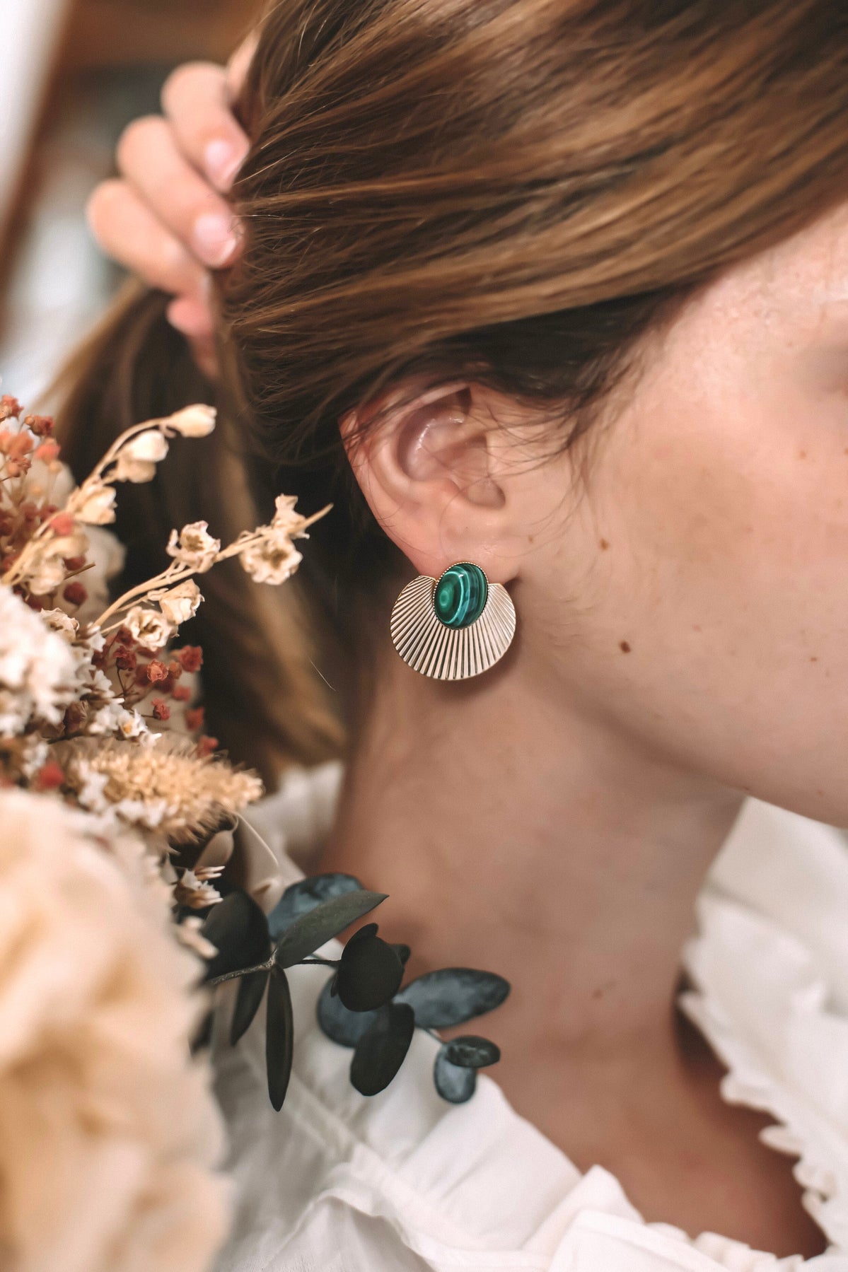 Ces Boucles Sunset en plaqué or ajoutent une touche d'élégance à votre tenue. La pierre semi-précieuse ovale apporte une touche de couleur tandis que le motif inspiré des rayons du soleil donne un effet lumineux. Idéales pour toutes occasions.