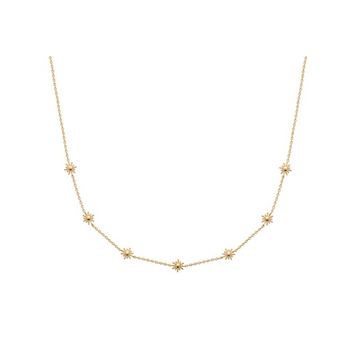 Le collier Astella se compose d’une fine chaîne dorée ponctuée de délicates étoiles scintillantes. Chaque motif, finement travaillé, reflète la lumière avec poésie et illumine le décolleté d’un éclat subtil. Une création élégante et intemporelle, idéale pour apporter une touche céleste à vos instants du quotidien comme à vos soirées d’exception.