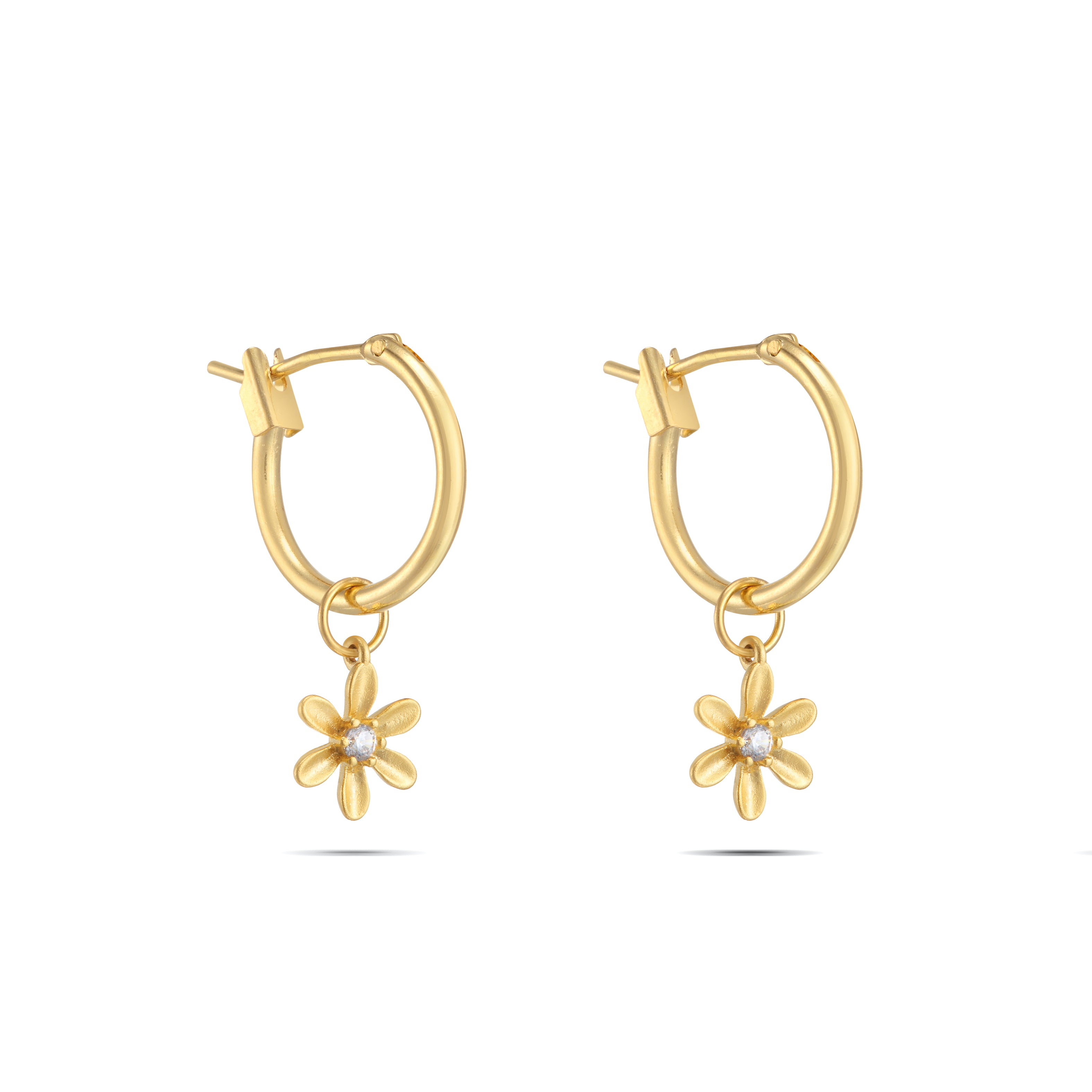 Une paire de belles boucles d'oreilles composées d'une créole et d'un pendentif en forme de fleur avec une pierre de zircon cristal.