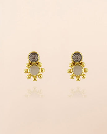 Les puces Vela allient finesse et éclat dans une harmonie délicate. Leurs deux pierres lumineuses, aux reflets doux et changeants, sont entourées d’un serti doré orné de perles d’or, rappelant les rayons d’un soleil miniature. À la fois discrètes et rayonnantes, elles illuminent le visage d’une lumière subtile. Inspirées par la constellation du même nom, elles célèbrent la féminité dans toute sa grâce céleste et intemporelle.