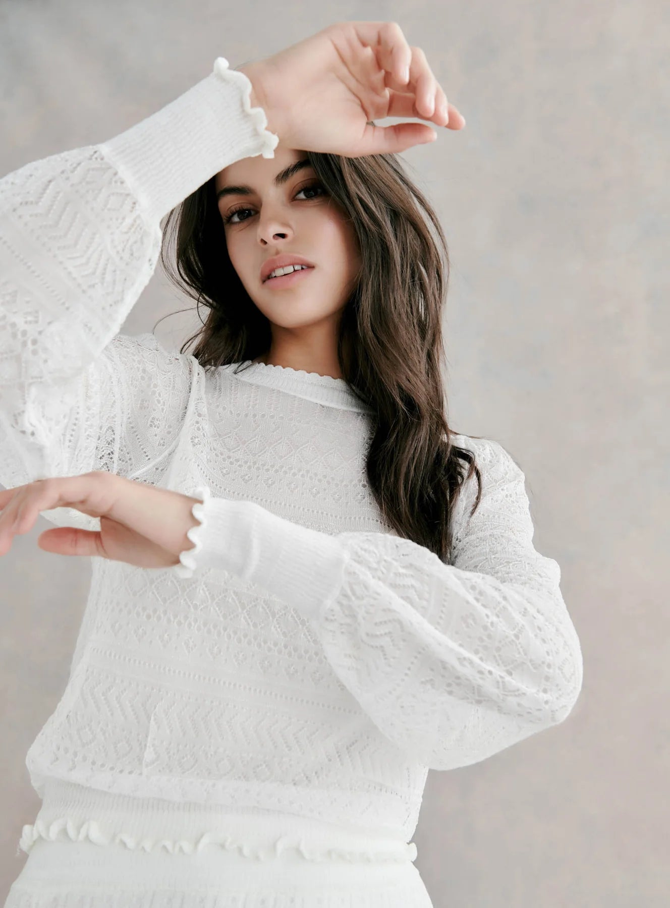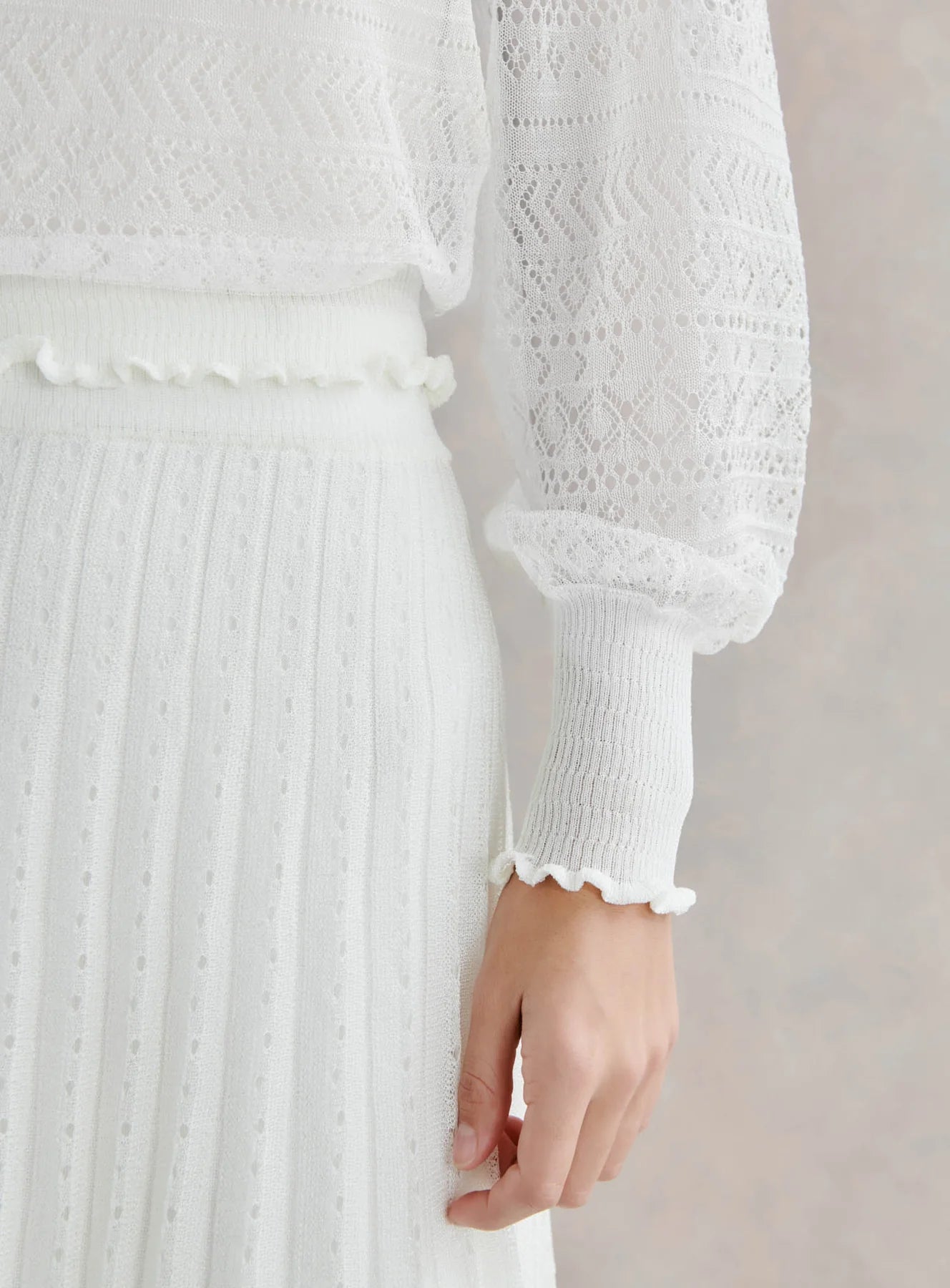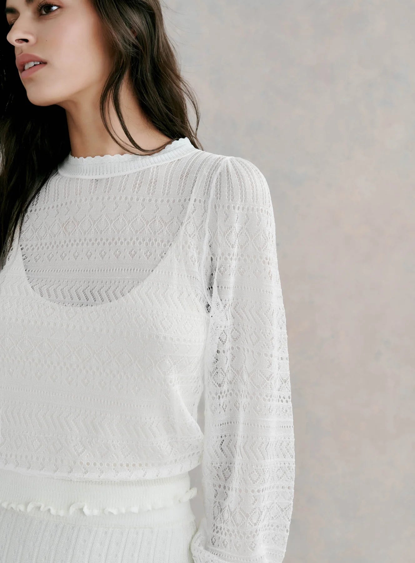 Top transparent en maille ajourée très délicate. Col montant. Manches bouffantes.