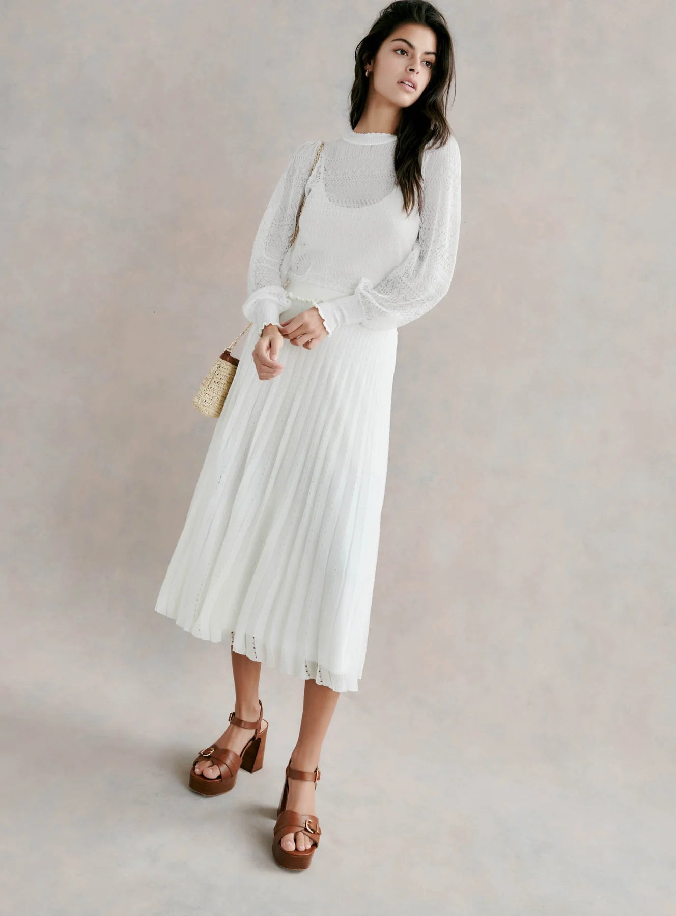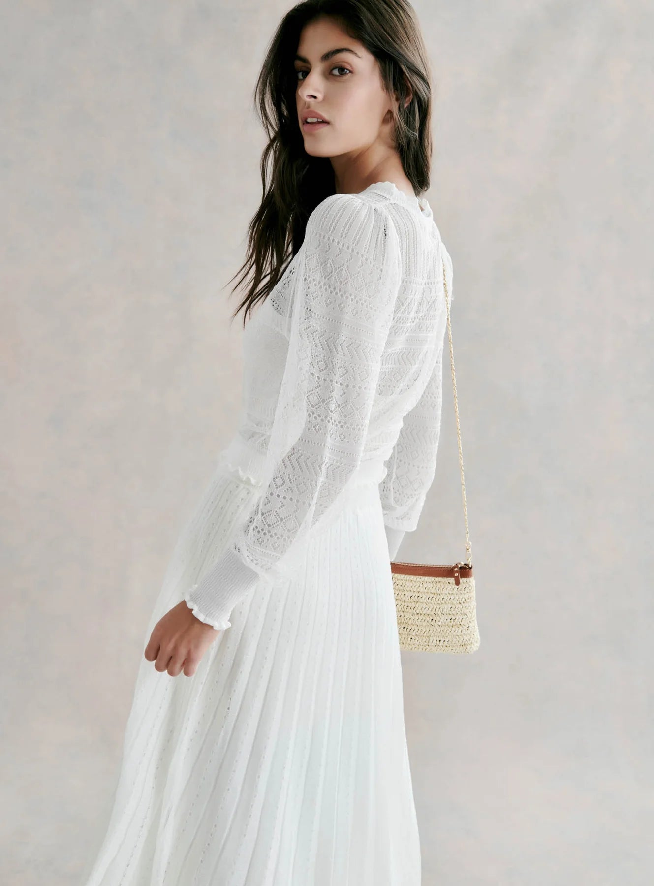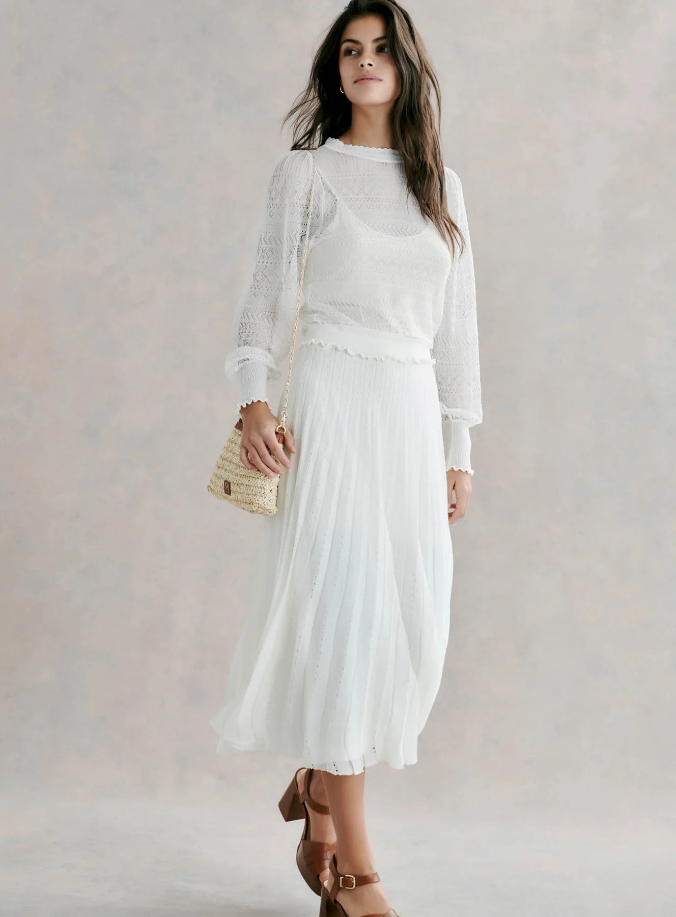 Top transparent en maille ajourée très délicate. Col montant. Manches bouffantes.