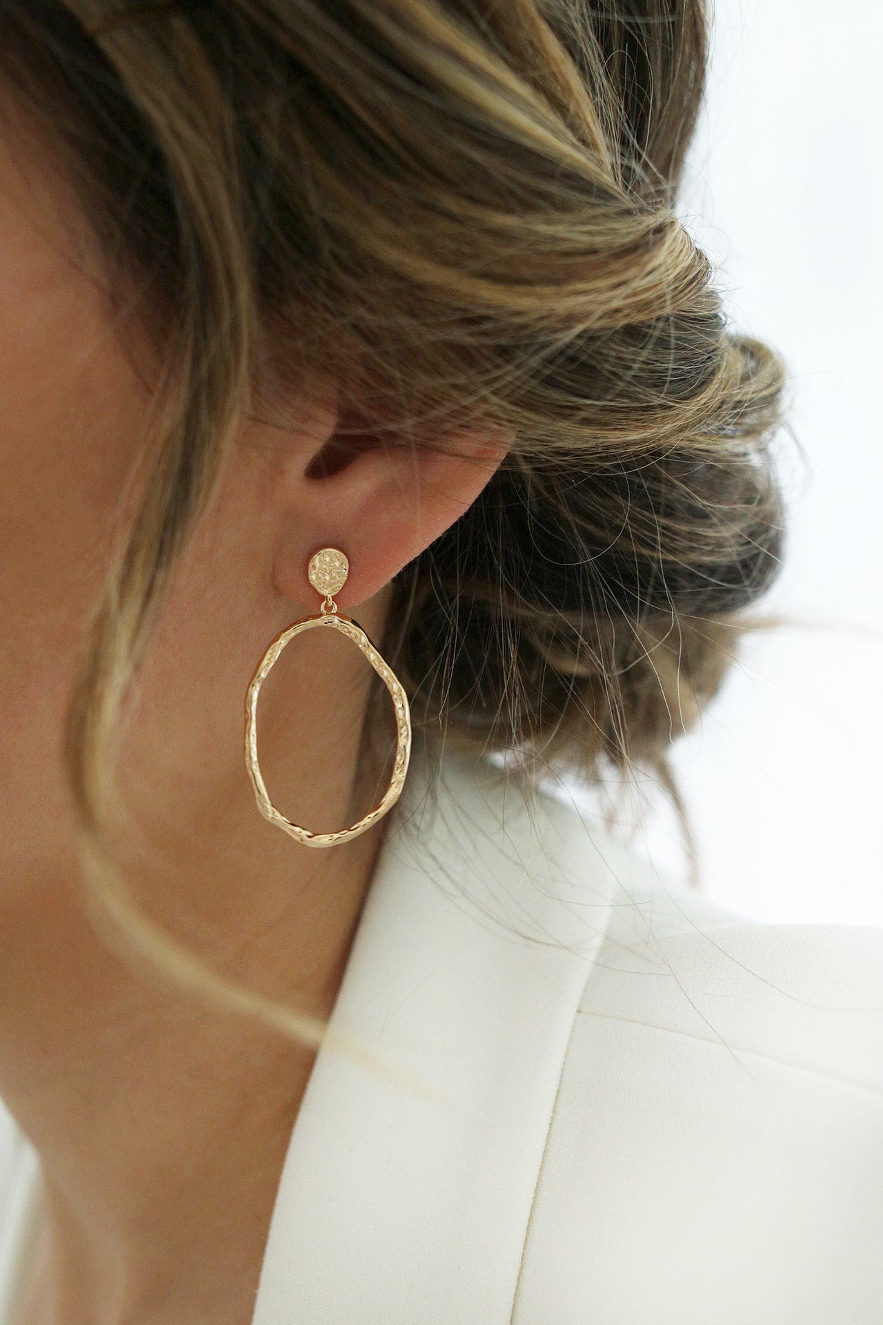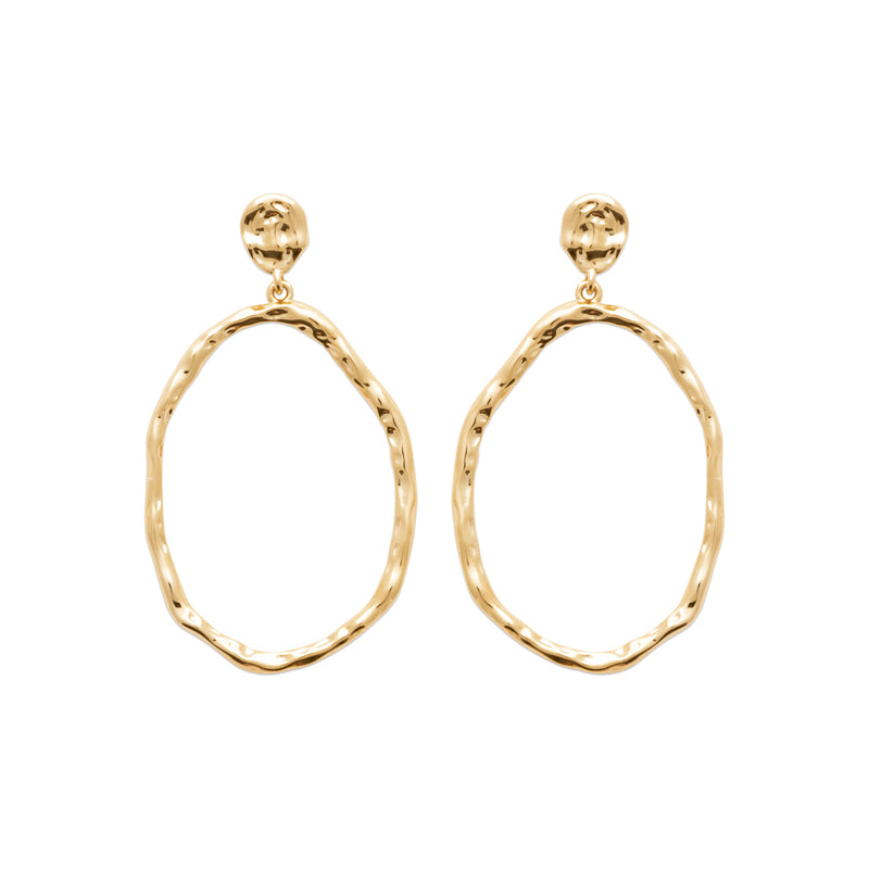 Cléa dessine un anneau aux contours irréguliers, délicatement martelé pour capter la lumière à chaque mouvement. Élancées et raffinées, ces boucles apportent une touche naturelle et moderne qui sublime le visage avec simplicité.