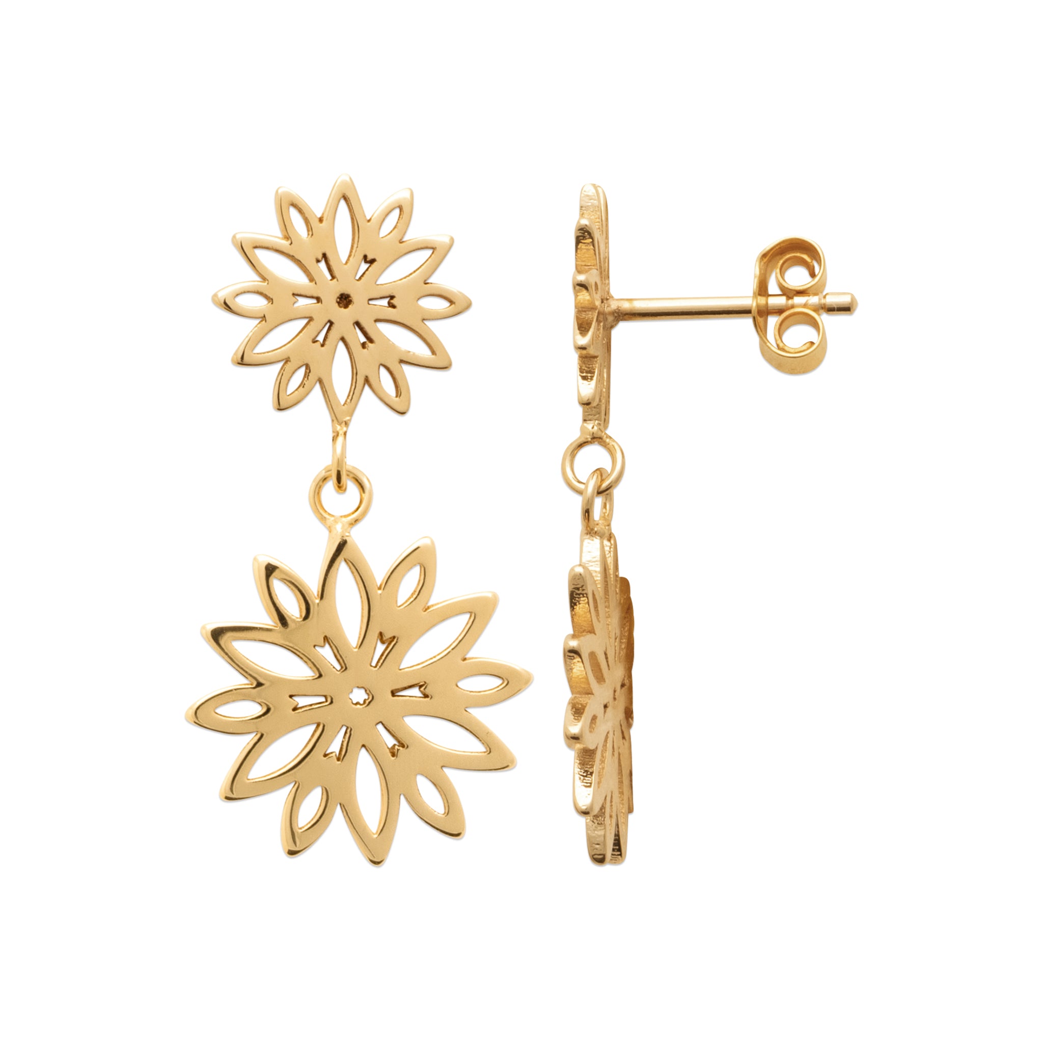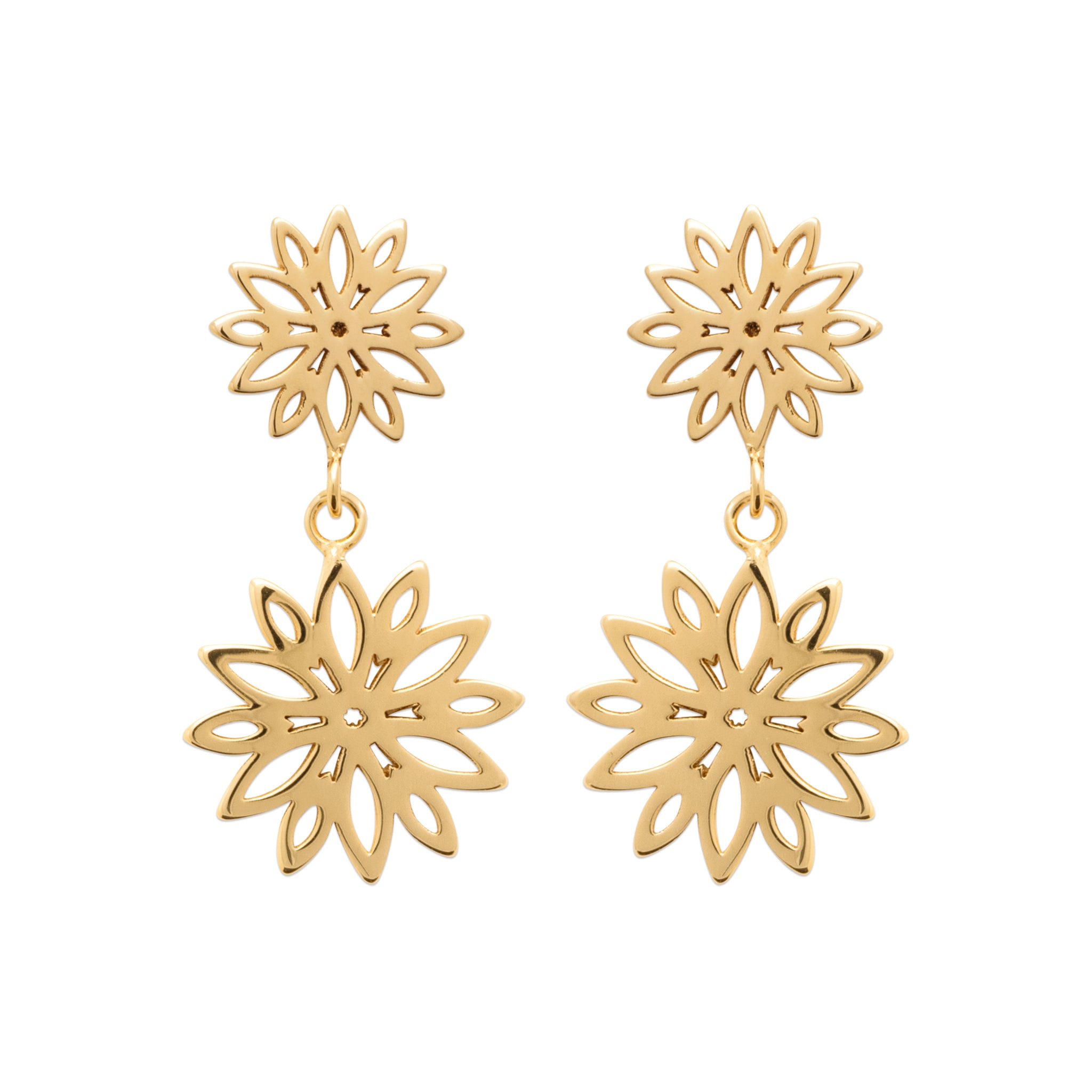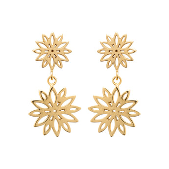 Luméa révèle un motif floral ajouré en double éclat, délicatement suspendu pour créer un mouvement fluide et lumineux. Légères et raffinées, ces boucles habillent le visage d’une élégance solaire, subtilement moderne.