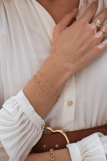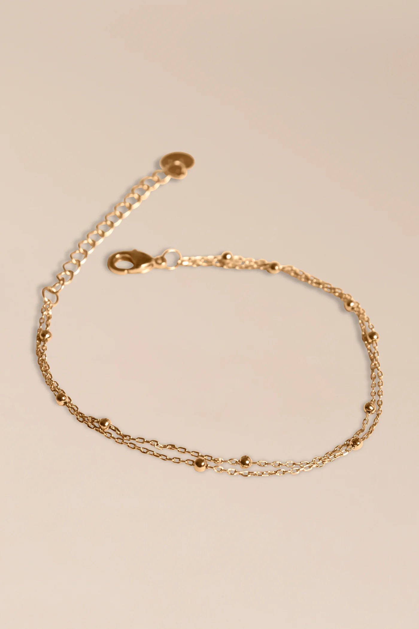 Bracelet composé d'une double chaine avec des petites billes délicates. Un effet deux en un parfait, qui va a avec tout, dans toutes les saisons. Une chaine de rallonge complète le bracelet pour s'adapter à toutes, parfait non ?