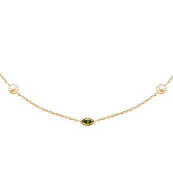 Nuria se pose au creux du cou comme un regard discret souligné d’or. Sa pierre verte allongée capte la lumière en silence, créant une présence fine, subtilement magnétique et pleine de caractère.