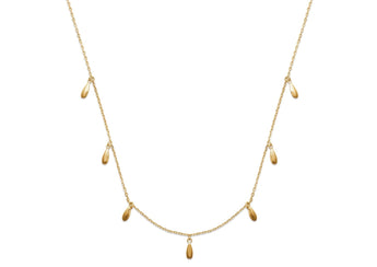 Sahira épouse le mouvement avec ses gouttes dorées suspendues, comme une pluie fine figée en lumière. Léger et vivant, il encadre le décolleté d’un éclat subtil qui suit chacun de vos gestes.