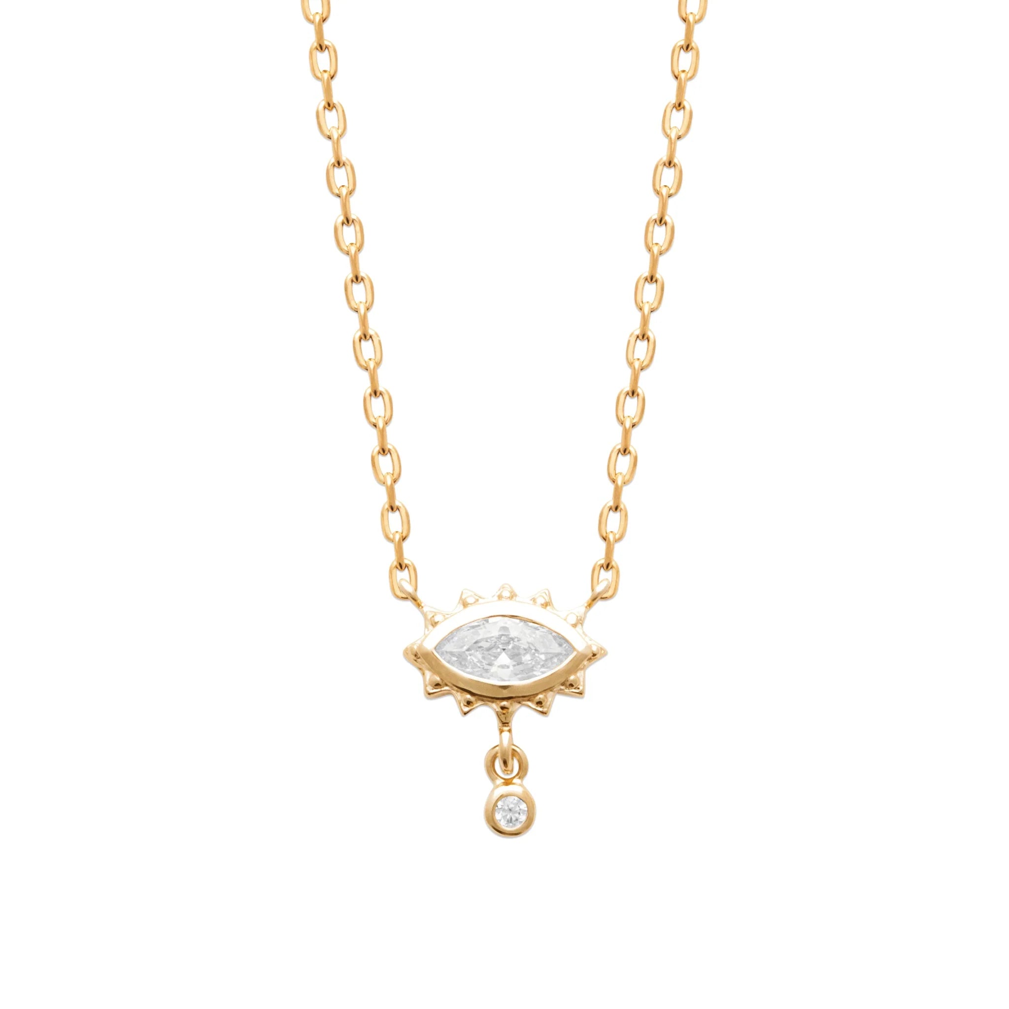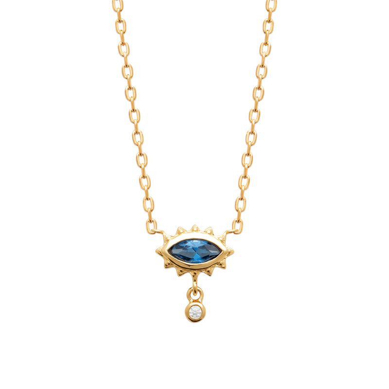 Zafira révèle un œil délicatement sculpté, illuminé par une pierre aux reflets envoûtants. Suspendu au creux du cou, ce collier attire la lumière et le regard avec une présence subtilement magnétique.