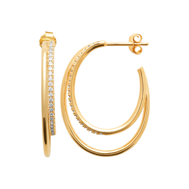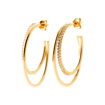 Créoles doubles au design épuré, soulignées d’une fine ligne de pierres délicatement serties. Élancées et lumineuses, elles apportent une élégance sophistiquée, subtile et résolument moderne.