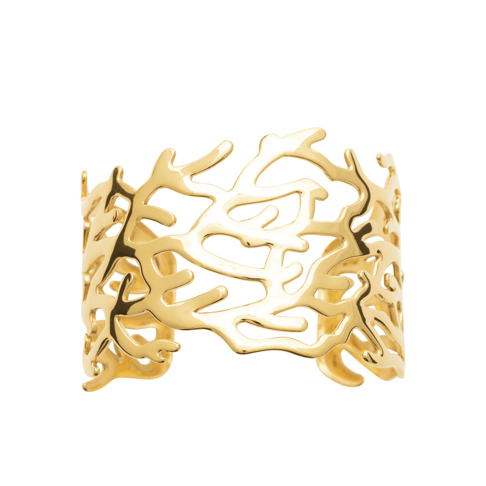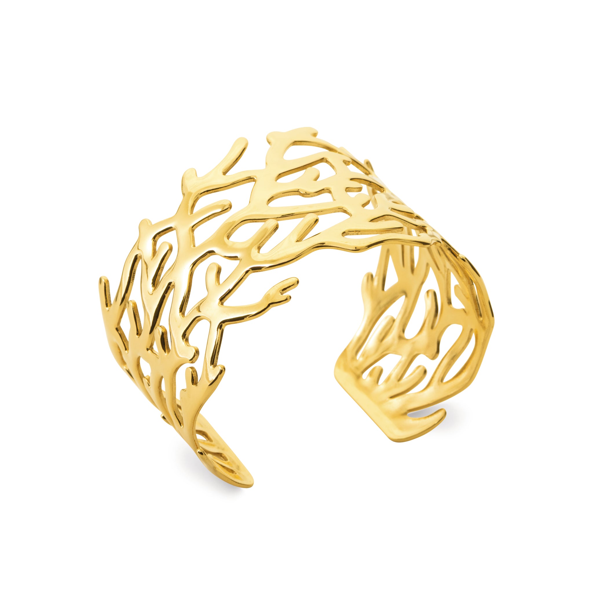 Cyra évoque les formes libres de la nature, comme des branches dorées entrelacées autour du poignet. Son design ajouré laisse respirer la peau tout en créant un jeu de lumière subtil et élégant.