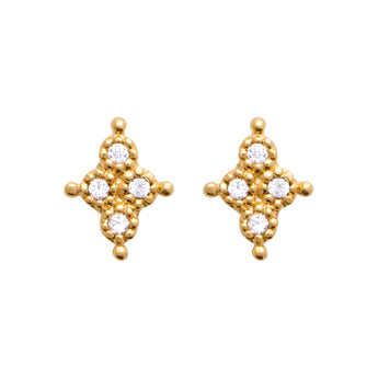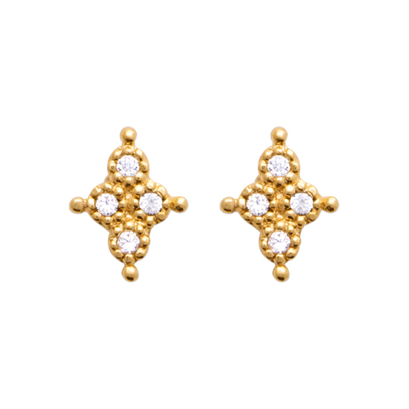 Aurelys dévoile une silhouette finement perlée, ponctuée d’éclats lumineux disposés en croix délicate. Raffinées et intemporelles, ces puces illuminent le visage d’une brillance subtile et élégante.