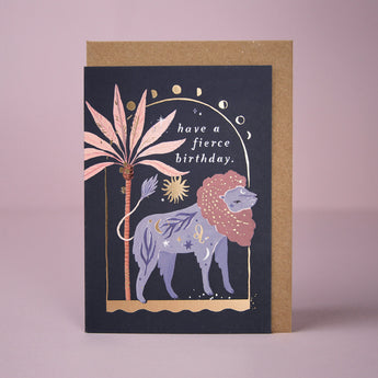Un Lion majestueux, sa toison d'un mauve poussiéreux ornée d'éclats scintillants en feuille d'or, domine le sombre indigo de cette Carte Anniversaire Lion. La lune étincelante annonce un ciel nocturne illuminé, qui proclame un « anniversaire féroce » !
