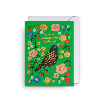 Idéale pour les anniversaires, cette carte représente un oiseau entouré de jolies fleurs. Montrez à vos proches que vous pensez à eux avec cette carte unique et colorée.