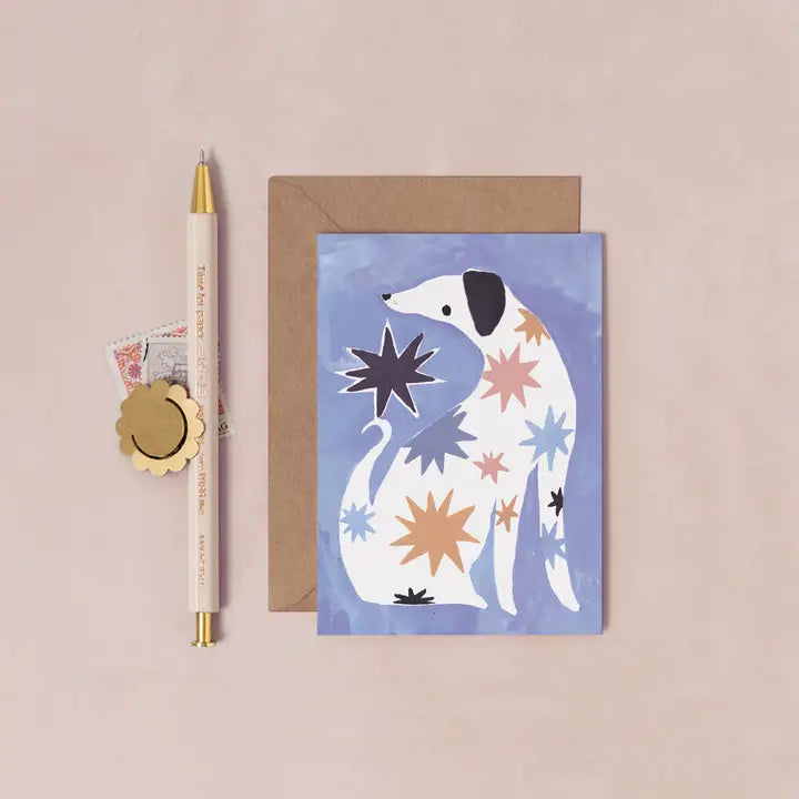 Envoyez des vœux chaleureux avec cette mini-carte chien. Son design amusant et élégant, avec un chien curieux sur un fond bleu et une étoile colorée, convient à toutes les occasions. Parfait pour les amoureux des chiens!