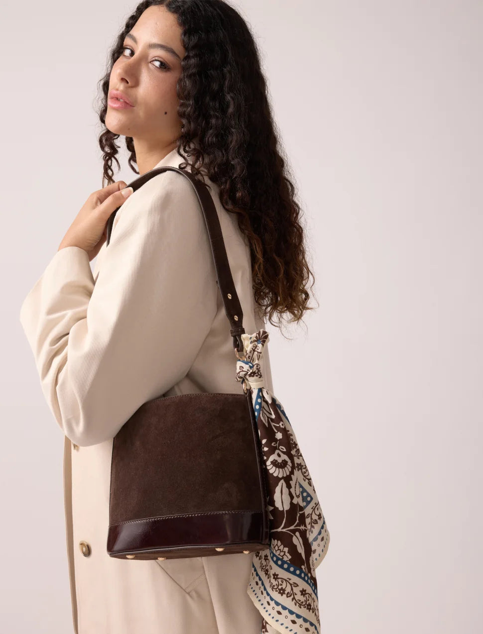 • Sac en cuir bi-matière cuir velours suède et cuir lisse chocolat.