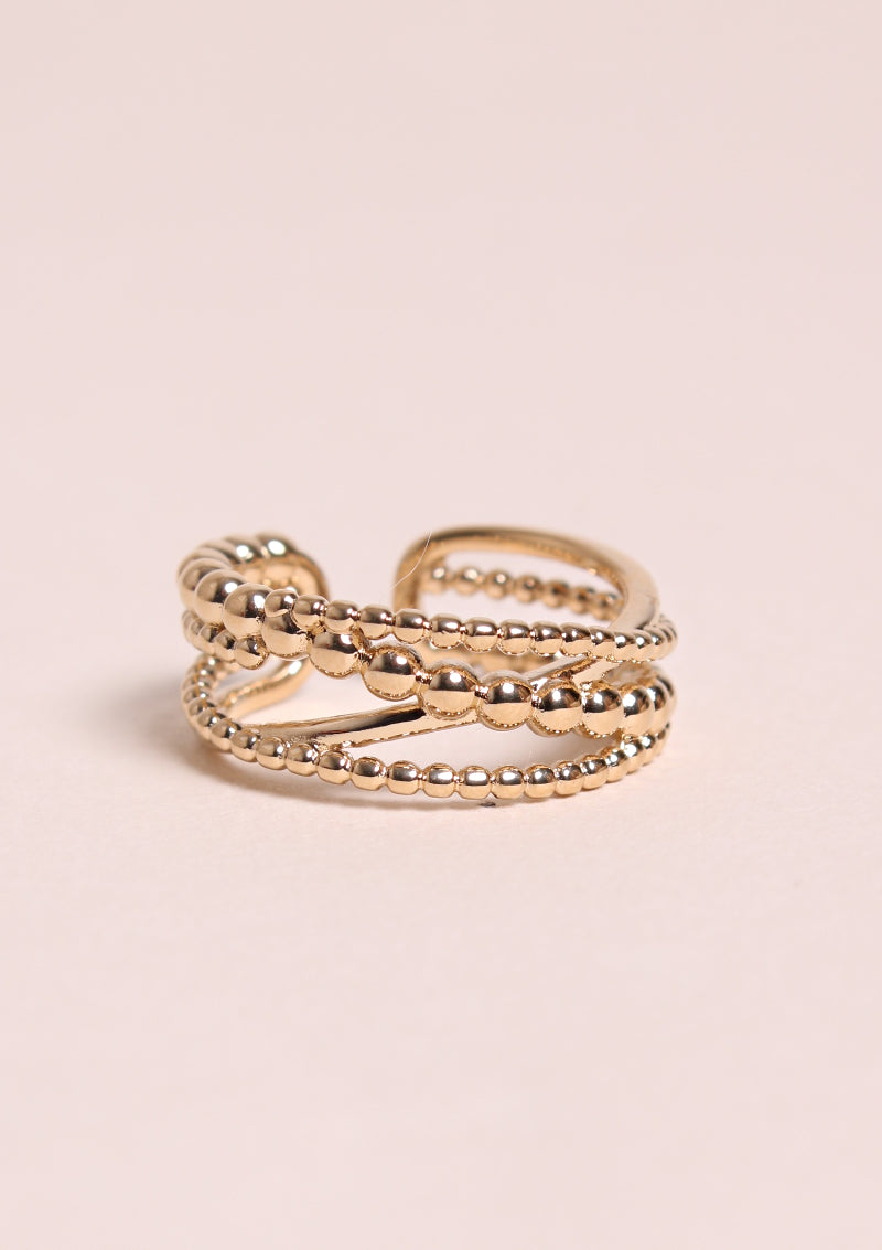 La bague Bertille, notre nouvelle favorite ! Composée de plusieurs anneaux aux petits détails billes, elle reste intemporelle et parfaite à assortir avec d'autres bagues fines. Réglable, en plaqué or 3 microns.