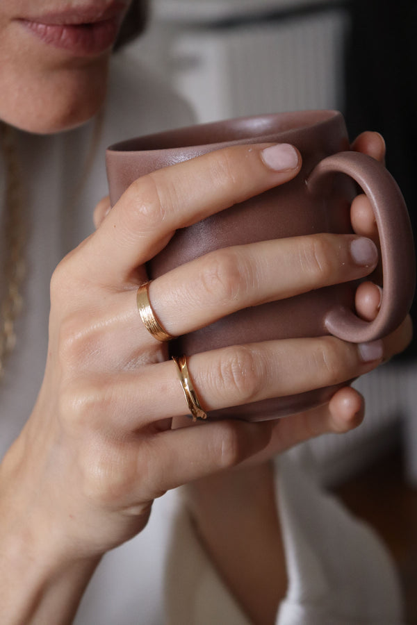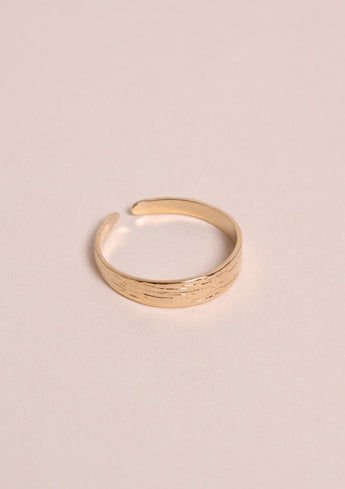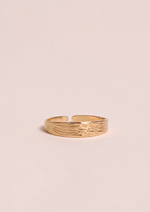 Bague fine réglable en plaqué or 3 microns, finition finement striée comme les motifs délicats d'une vague. Le plus petit des modèles Dana qui saura venir sublimer discrètement vos mains.
