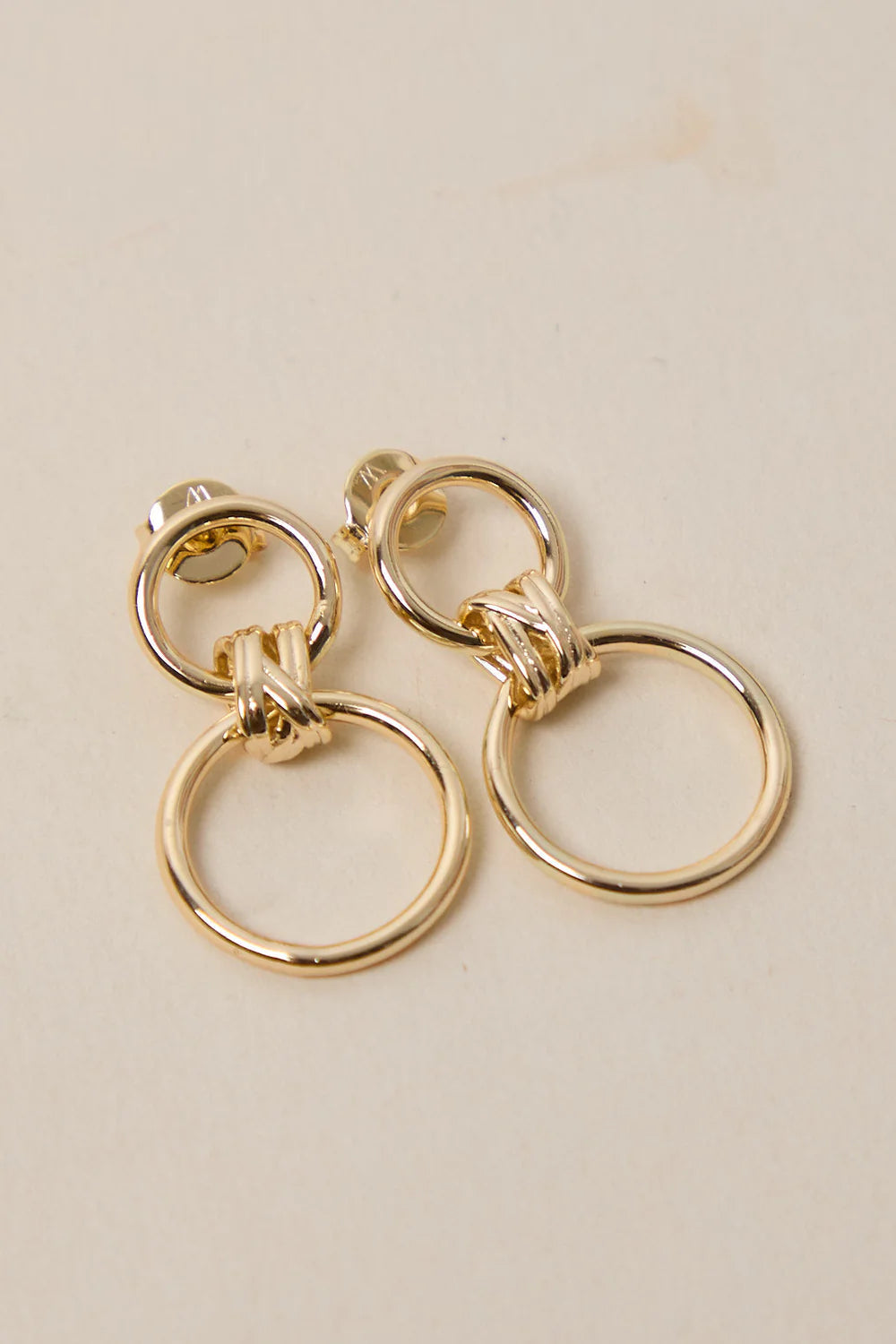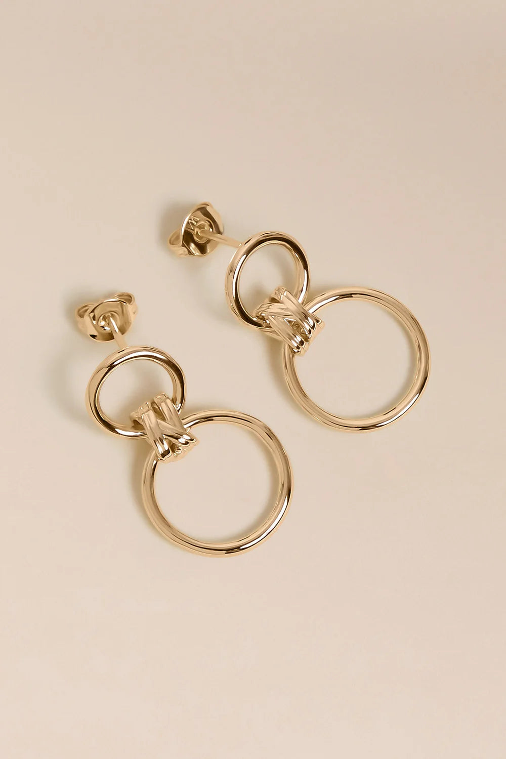 Boucles d'oreilles dorées composées de deux cercles reliés par un joli élément détaillé. Les cercles sont mobiles et apportent de la légèreté à ce modèle, pour une tenue élégante à tous moment.