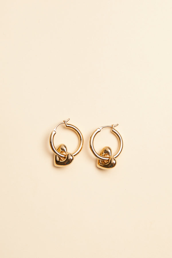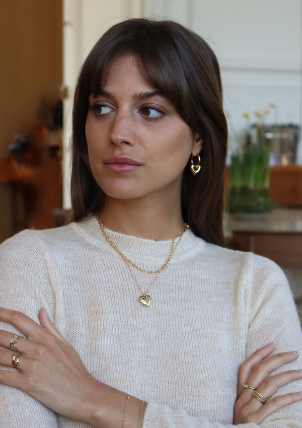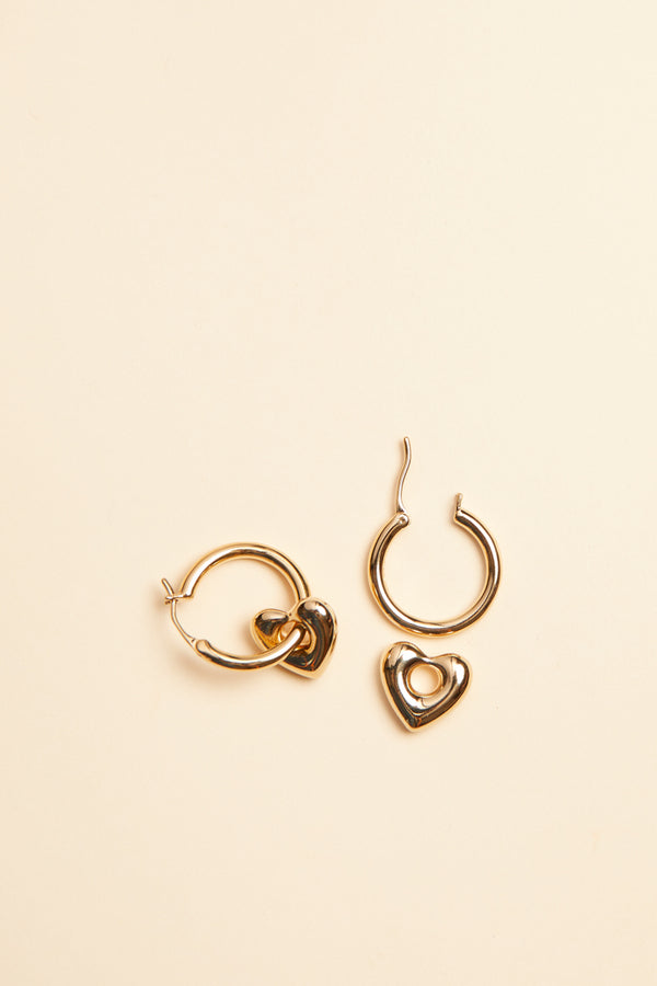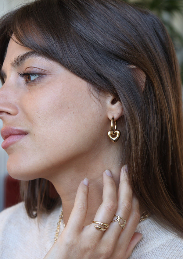 Les Jill, les nouvelles boucles incontournables de notre collection ! Elles sont composées d'une paire d'anneau et de pendentifs en forme de coeurs amovibles, en plaqué or 3 microns.