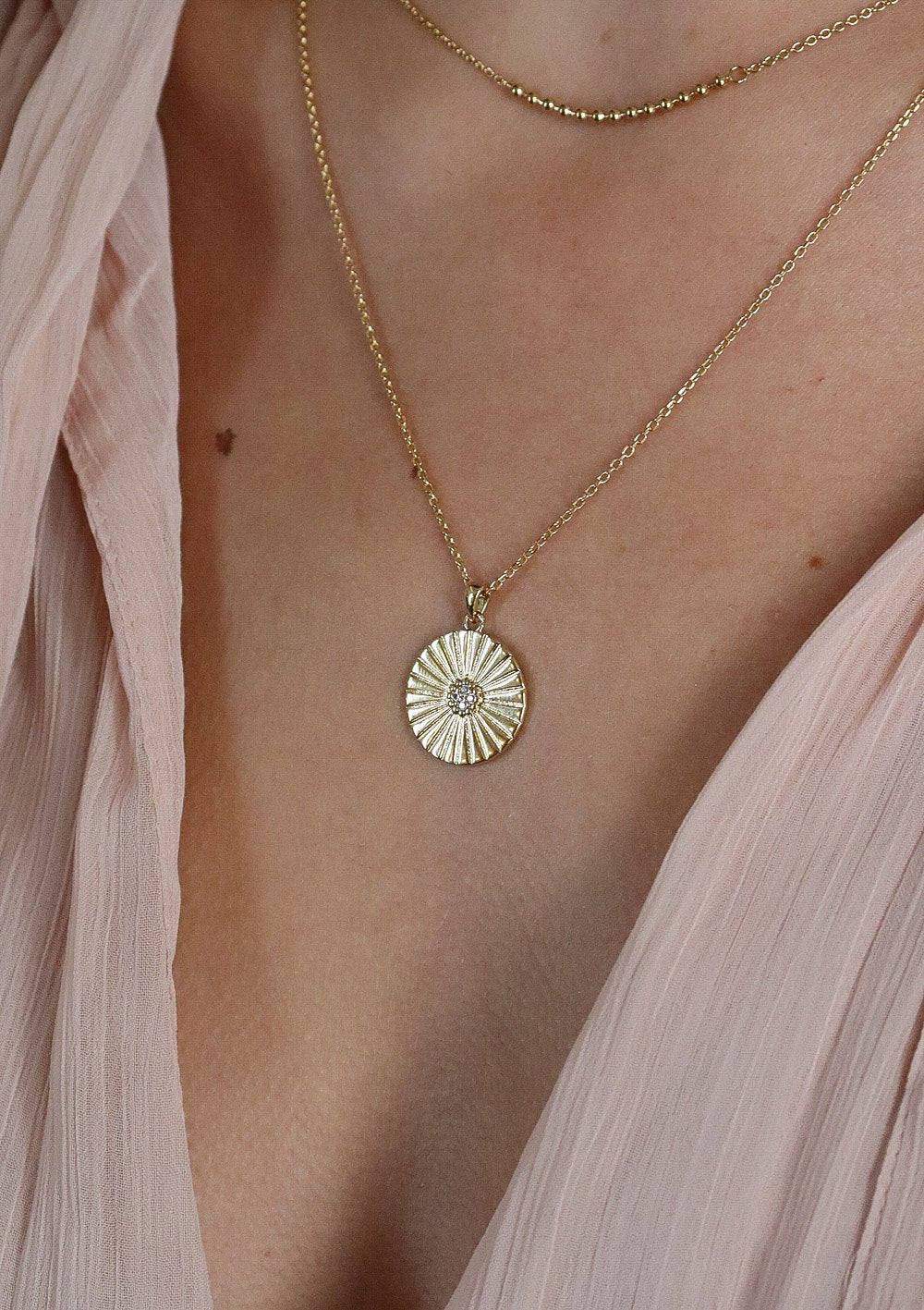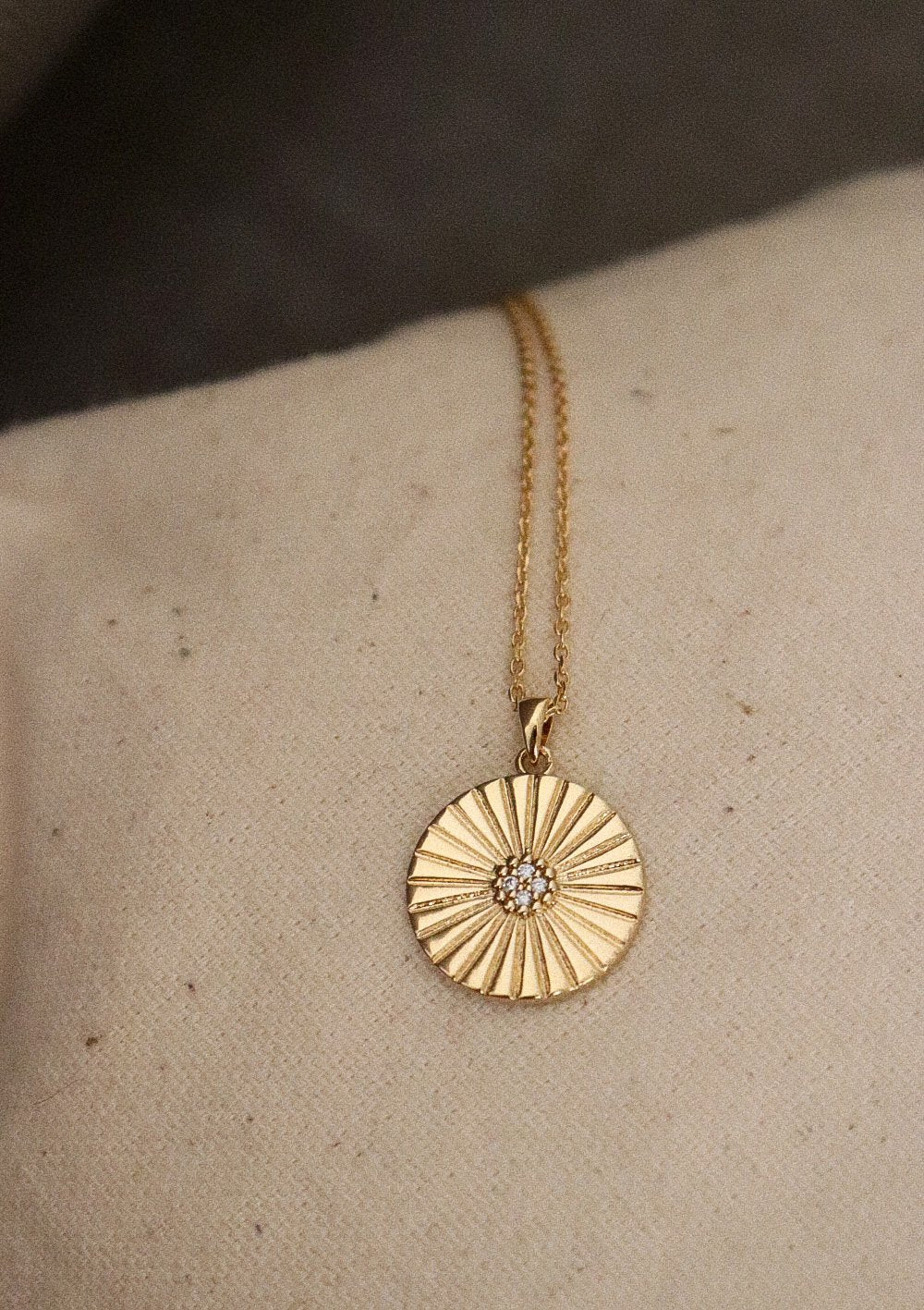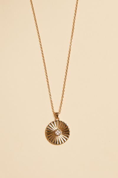 Collier avec un pendentif solaire serti d'un zirconium au centre. Parfait mélange entre élégance et vintage !