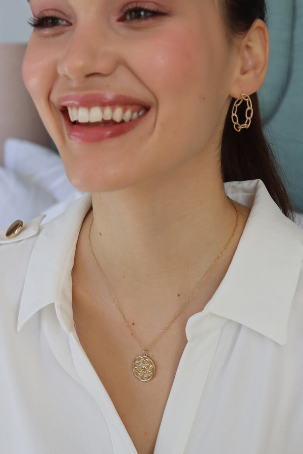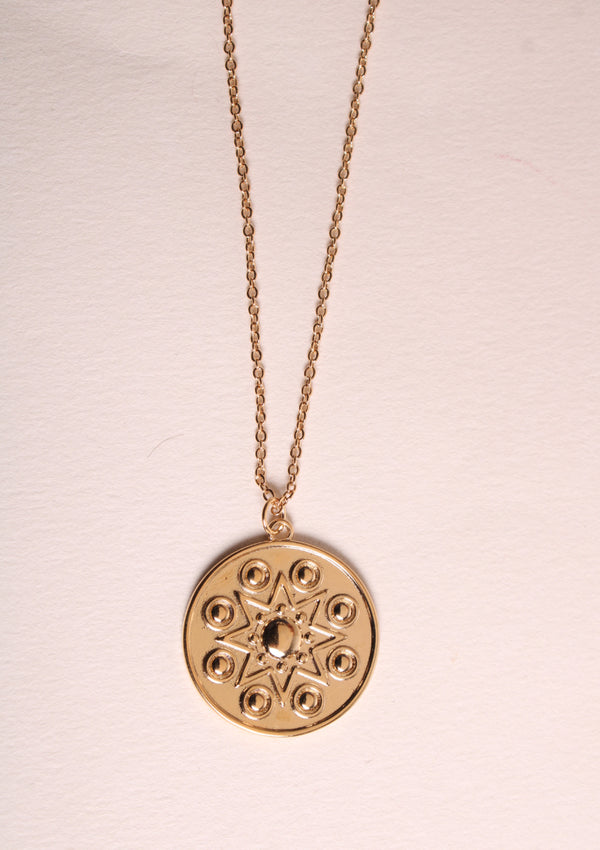 Découvrez le collier Juliane, collier avec chaine classique et médaillon rond avec motif étoile et détail cercle en relief.