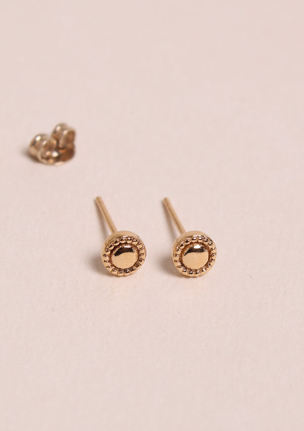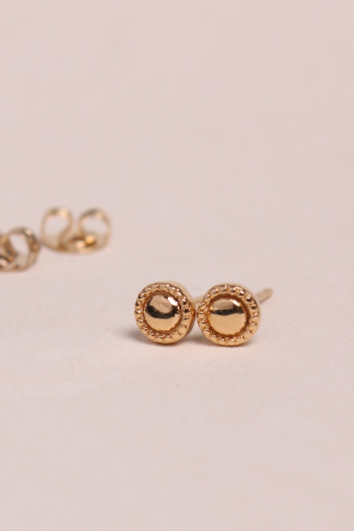 Petits clous ronds aux bords travaillés en plaqué or 3 microns avec fermoirs poussettes.
