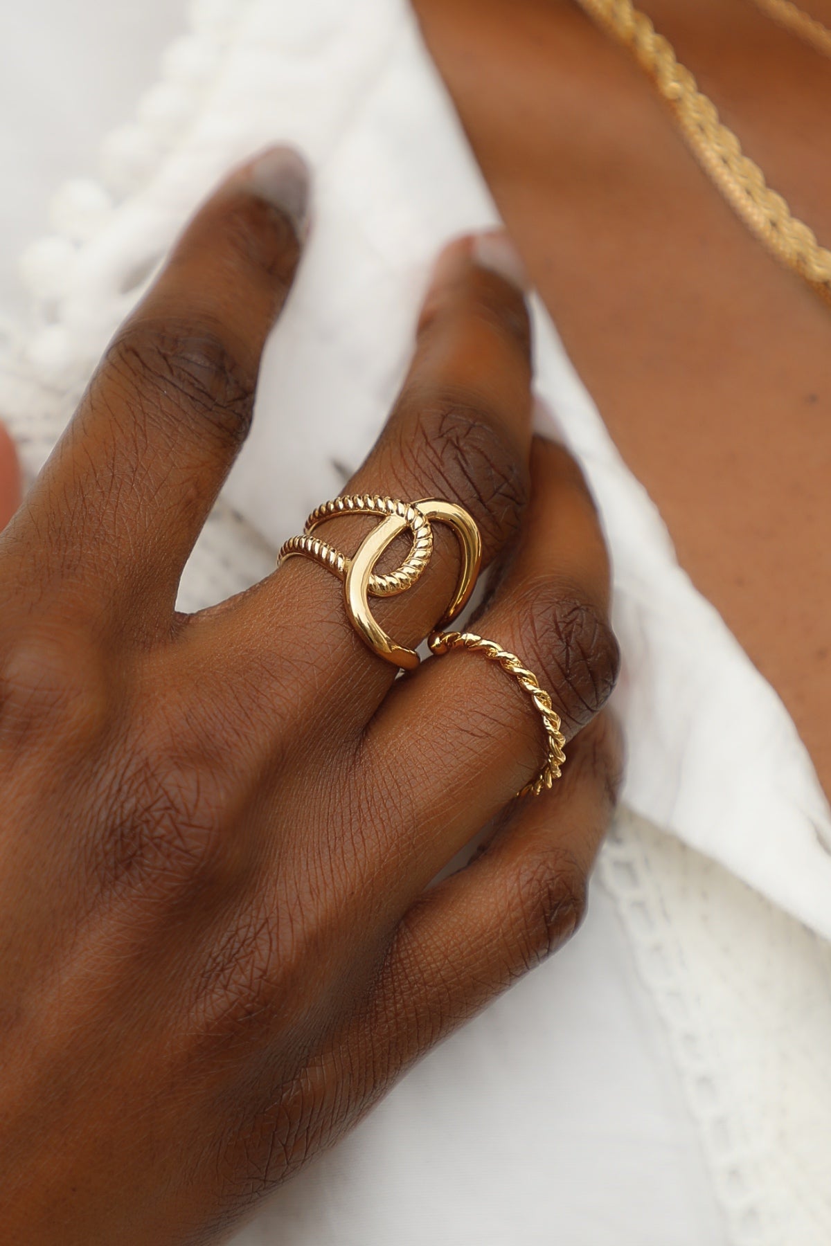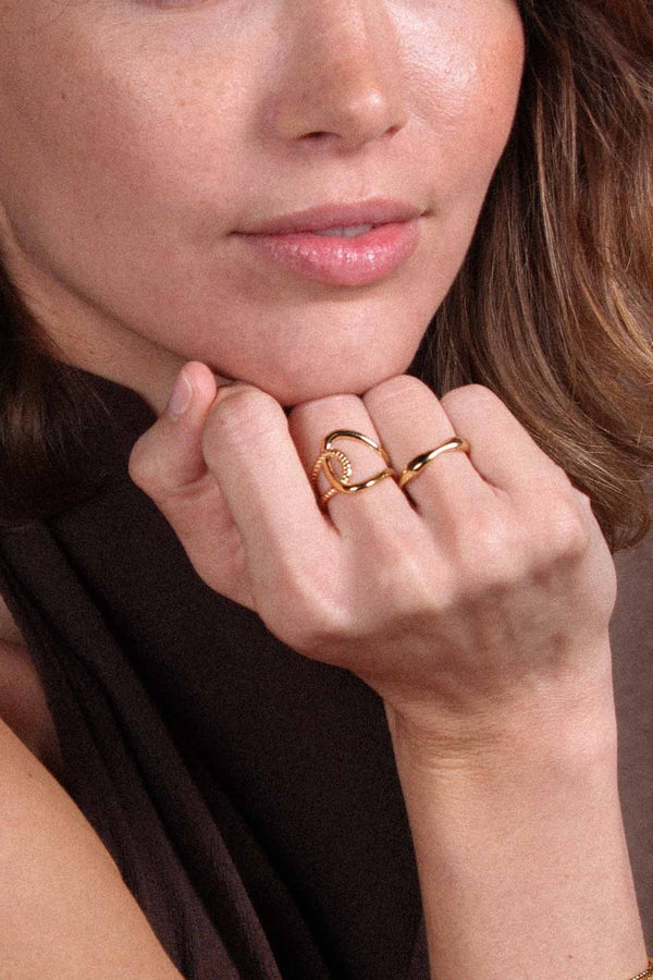 La bague Lane est composée d'un anneau lisse et d'un anneau torsadé qui s'entrecroisent. Cette bague est réglable.