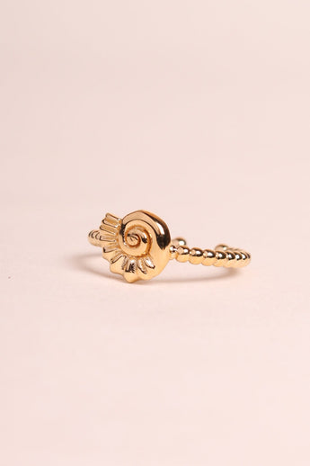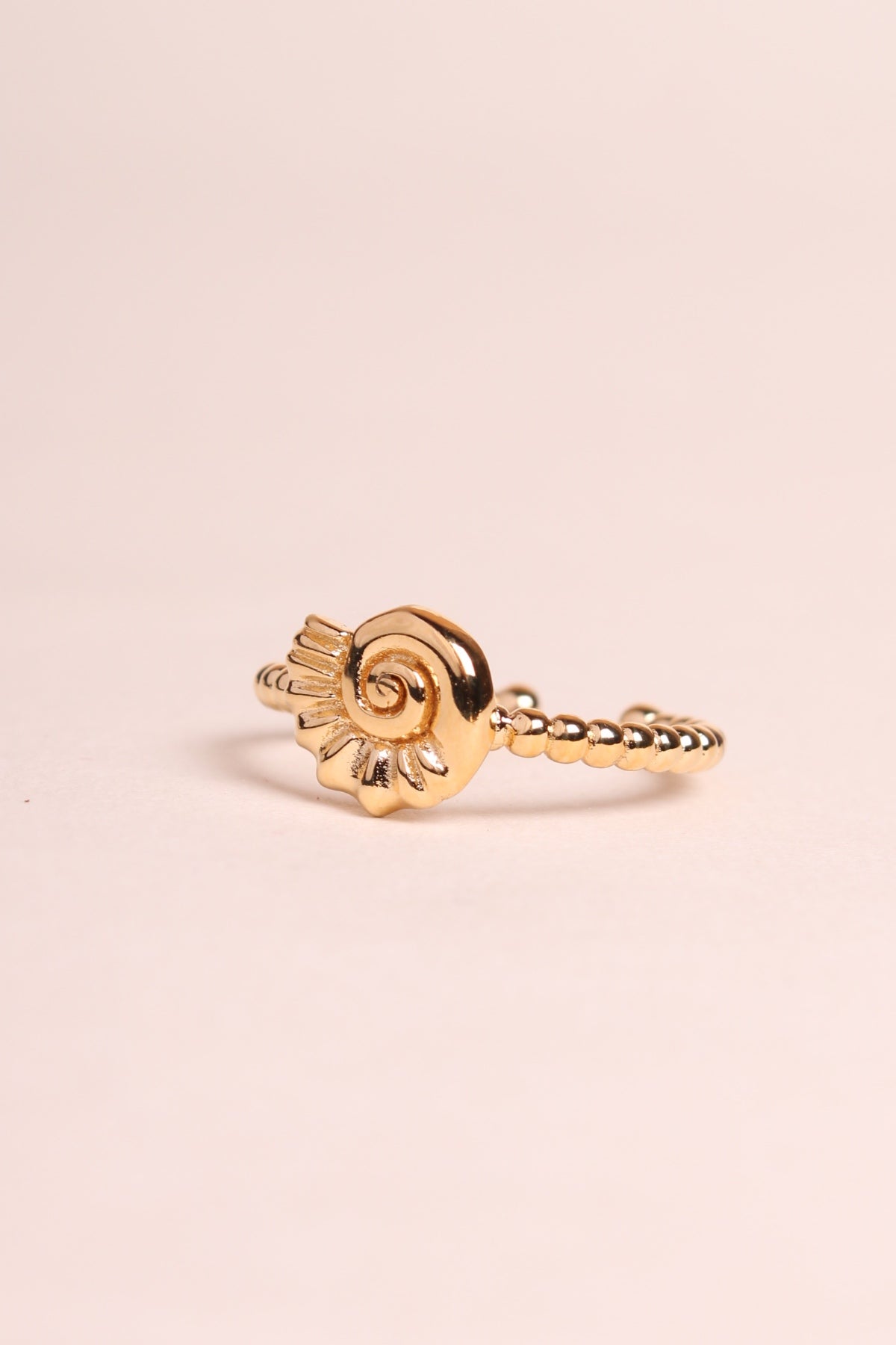 Bague composée d'une succession de billes et d'un coquillage finement travaillé. En plaqué or 3 microns.