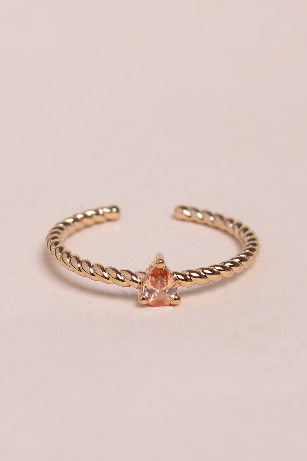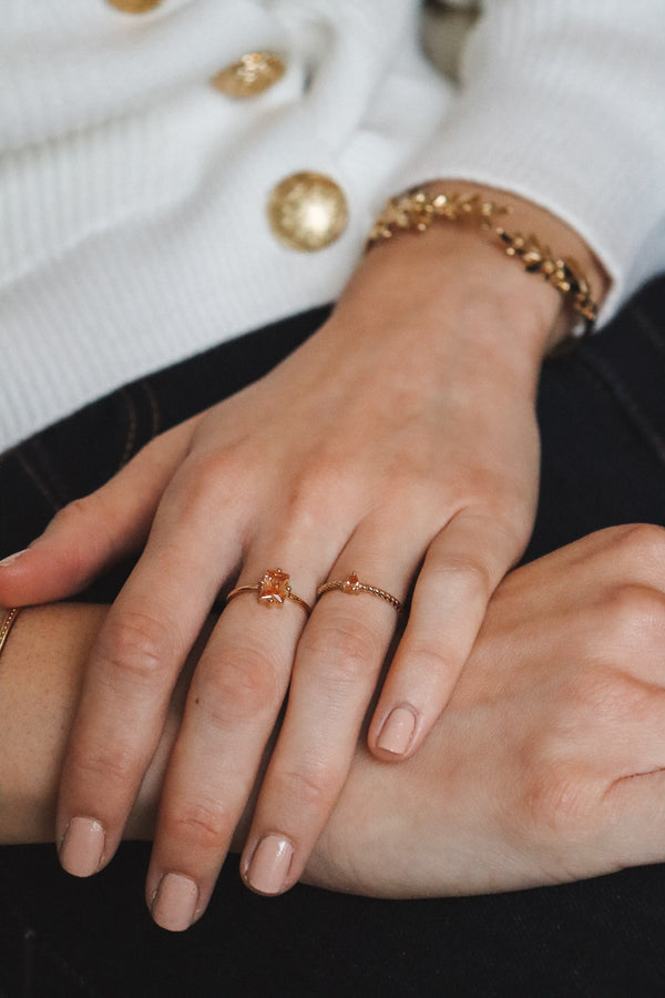 Notre petite bague Dahlia réglable en plaqué or 3 microns sertie d'une jolie pierre champagne !