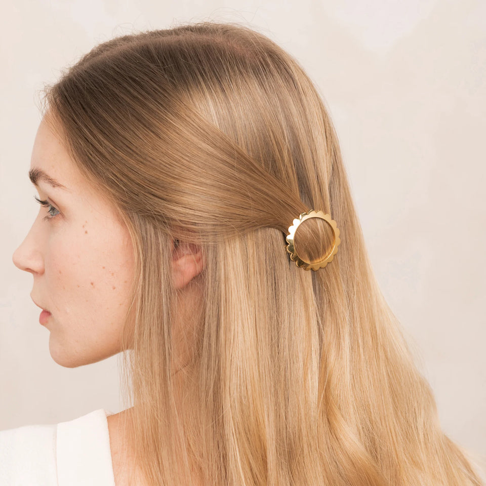 Barrette ronde plate, détail forme "fleur". Légèrement incurvée pour épouser la forme de la tête. Attache plate.