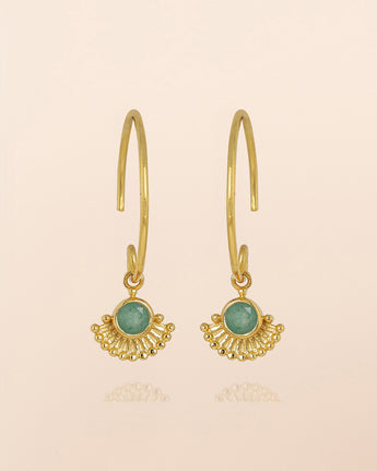 Les boucles pendantes Dorado capturent l’éclat du soleil couchant dans un design à la fois délicat et audacieux. Leur forme en éventail doré encadre une pierre, symbole de féminité et de vitalité. L’association subtile de la lumière dorée et des nuances vibrantes crée un bijou rayonnant, parfait pour illuminer vos journées comme vos soirées.