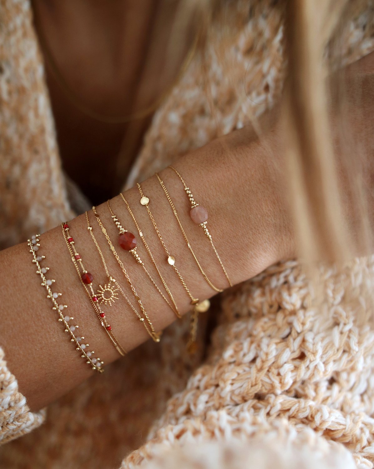 Bracelet  issu de la collection Boisée. Ce bracelet double chaine est orné d'un petit soleil qui donnera du peps à vos poignets!