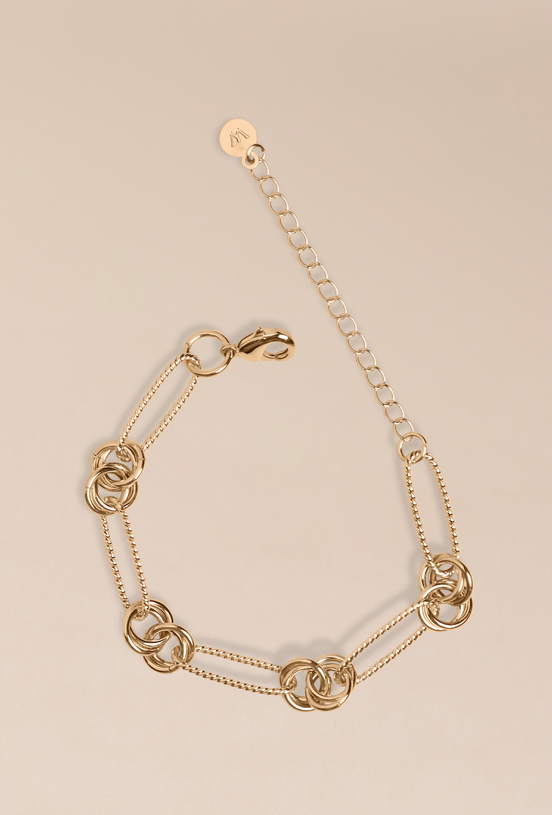 Le bracelet Marianne, un design composé d'une maille allongée légèrement striée reliée par des anneaux doubles pour un rendu "nœud". Un bracelet à assortir avec une autre de nos mailles fines.
