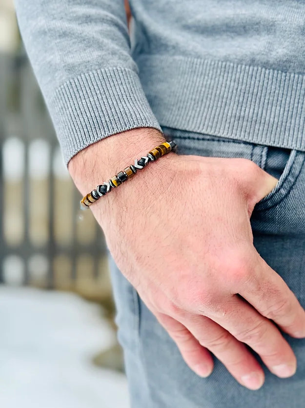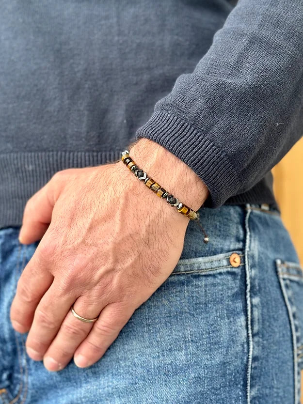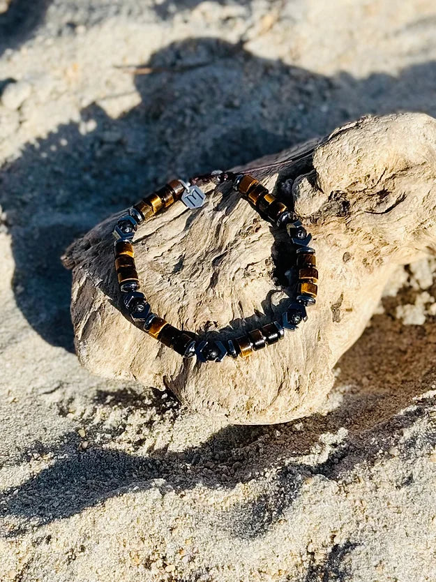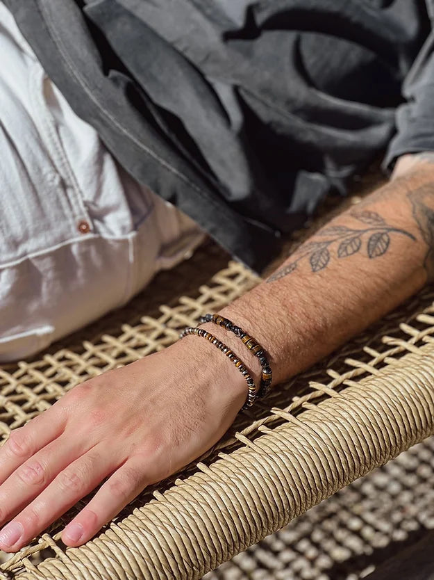 Le bracelet Stevie est d'inspiration ethnique, ses reliefs uniques mêlent le mat et le brut, associés à l'œil de tigre pour un résultat audacieux !