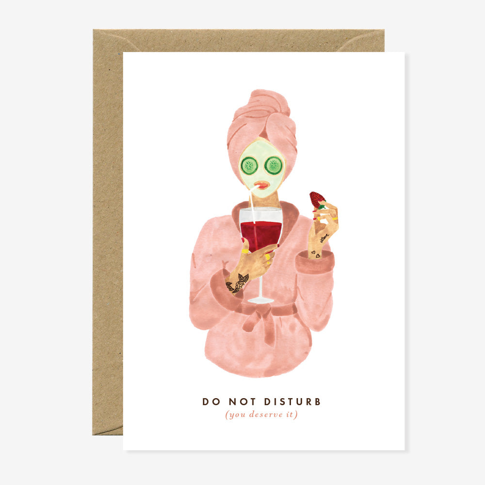 La carte de vœux Do Not Disturb d’All the Ways to Say est un clin d’œil amusant pour rappeler de prendre du temps pour soi. Elle met en scène une femme en peignoir rose, serviette nouée, masque aux concombres, un verre de vin à la main et une fraise gourmande, idéale pour les amateurs de détente et de cocooning. 🍷🥒