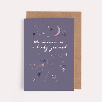 Carte avec étoiles et lune illustrées et lettrage "l'univers a de la chance que tu existes". Parfaite pour envoyer un message juste parce que ou à quelqu'un que vous aimez.