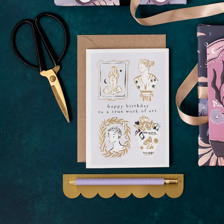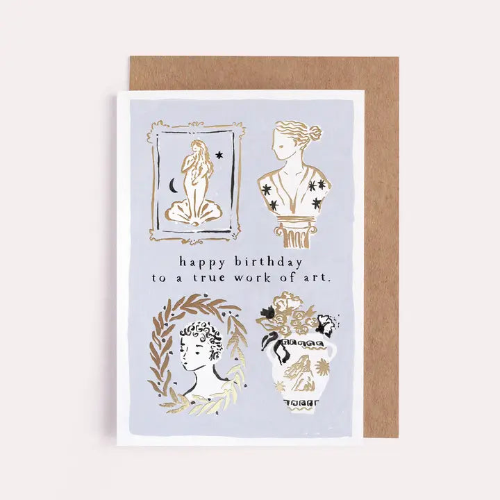 Envoie-lui une œuvre d'art pour son anniversaire avec cette carte de qualité supérieure. Les peintures stylisées, les sculptures et les vases anciens illustrent notre sentiment envers cette personne belle, fabuleuse et créative. « Tu es une œuvre d'art », disait la légende de cette carte.