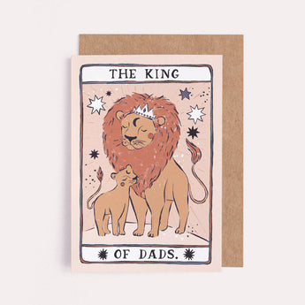 La carte du roi des papas avec un dessin de tarot représentant un lion fier avec son petit, parfaite pour l'anniversaire de papa ou la fête des pères.