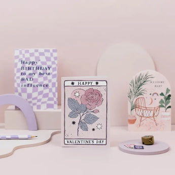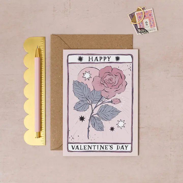 Inspirée des cartes de tarot, la Carte Valentine est un cadeau original pour la Saint-Valentin. Avec une rose peinte à la main, cette carte apportera amour et romance à votre bien-aimé(e). Un souvenir unique pour célébrer l'amour et la magie de la Saint-Valentin.